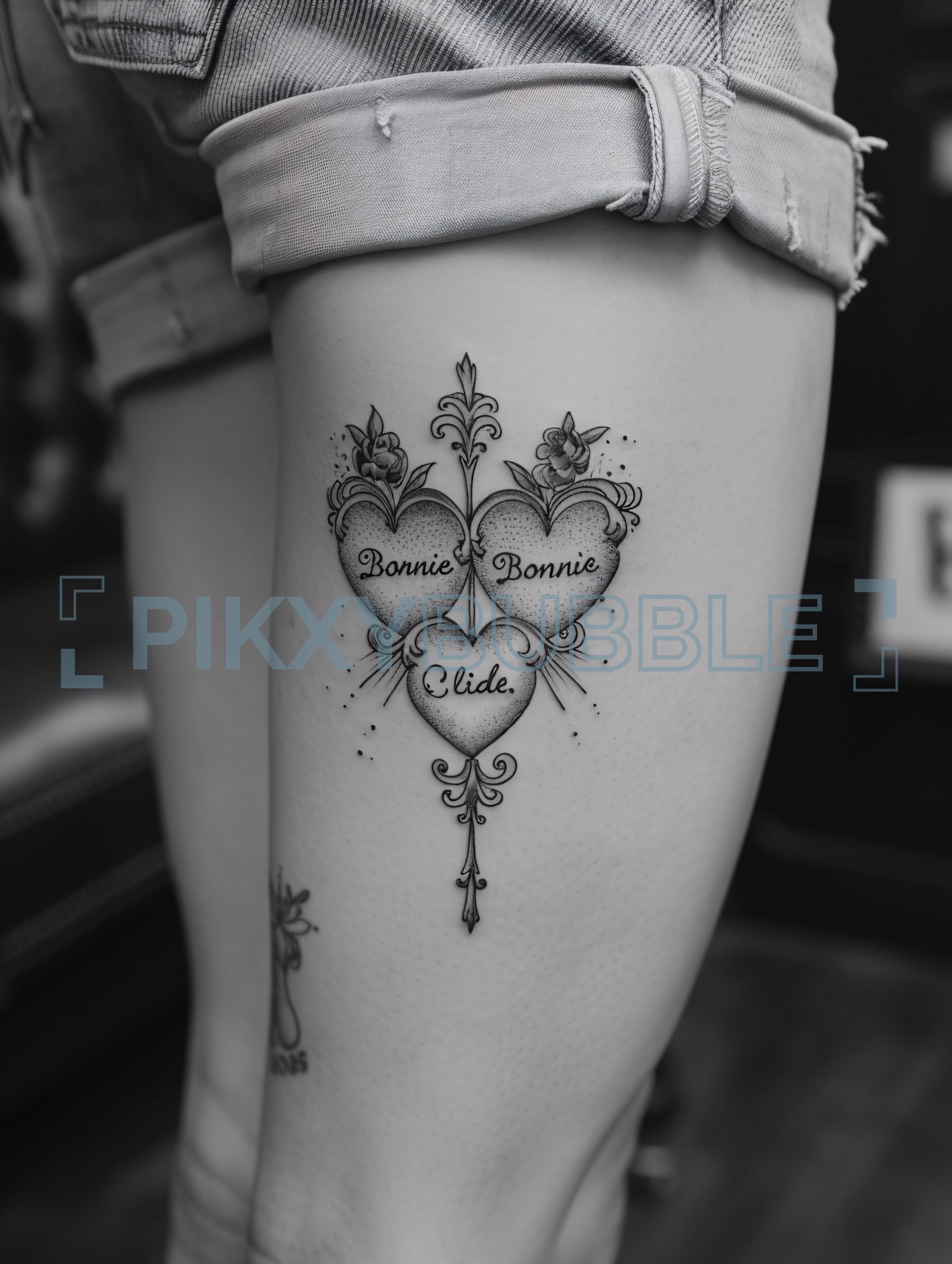 Tatouage délicat représentant des cœurs entrelacés, un symbole d'amour et d'attachement. Ce design inclut des éléments floraux qui ajoutent une touche d'élégance.