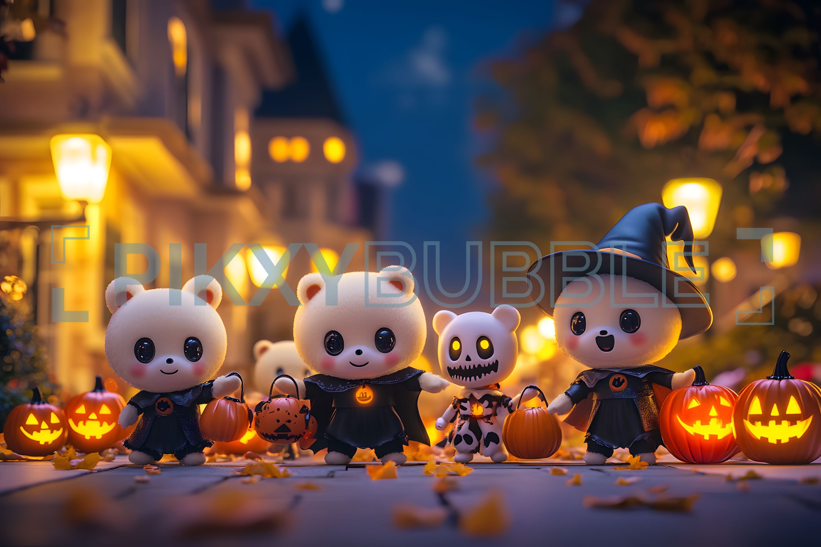 Ces petits pandas sont prêts pour Halloween ! Ils portent des costumes amusants et se promènent avec des citrouilles.