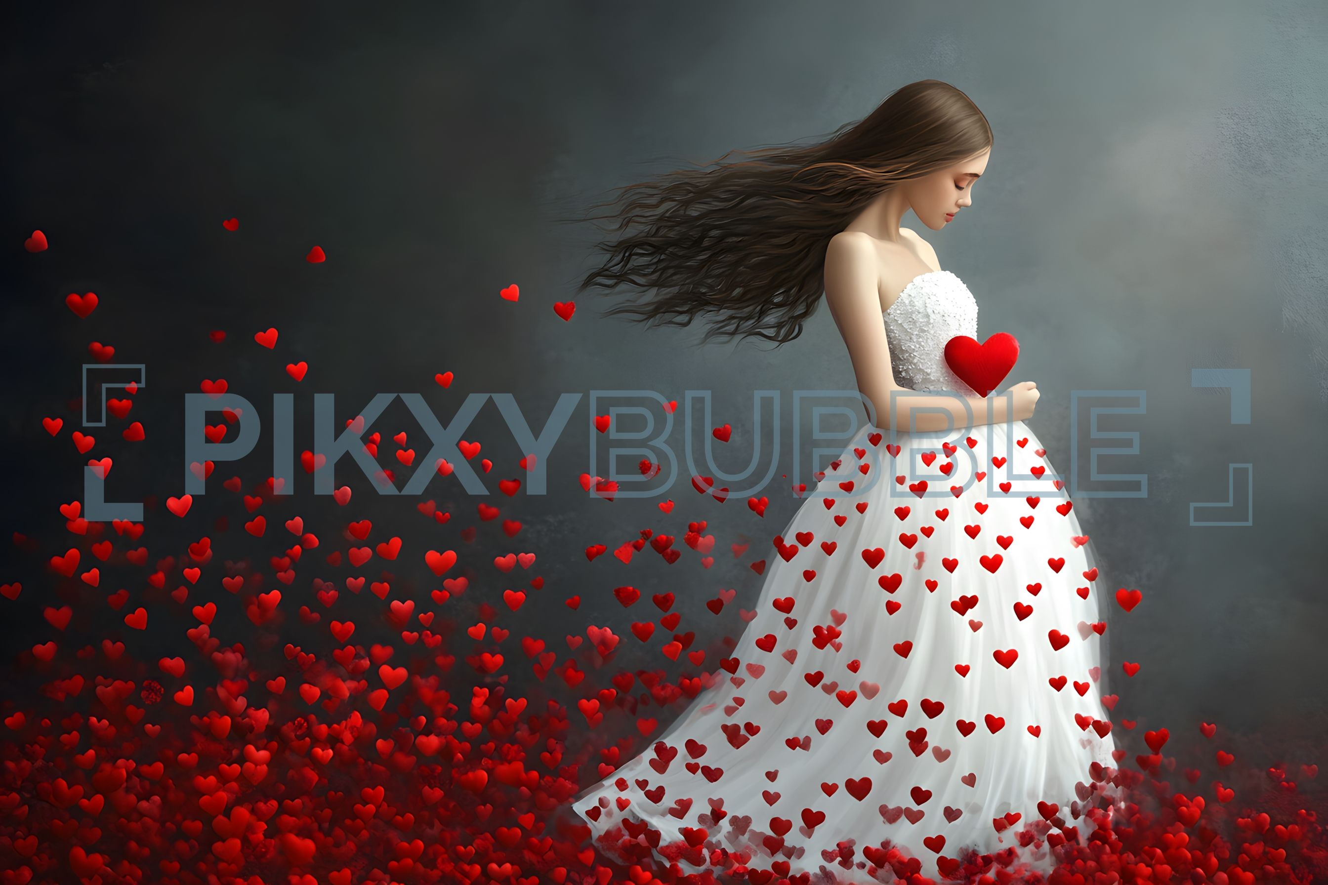 Une célébration de l'amour à travers une scène magique. Plongé dans un monde de cœur, la femme porte une robe blanche magnifique, entourée de cœurs rouges flottants.