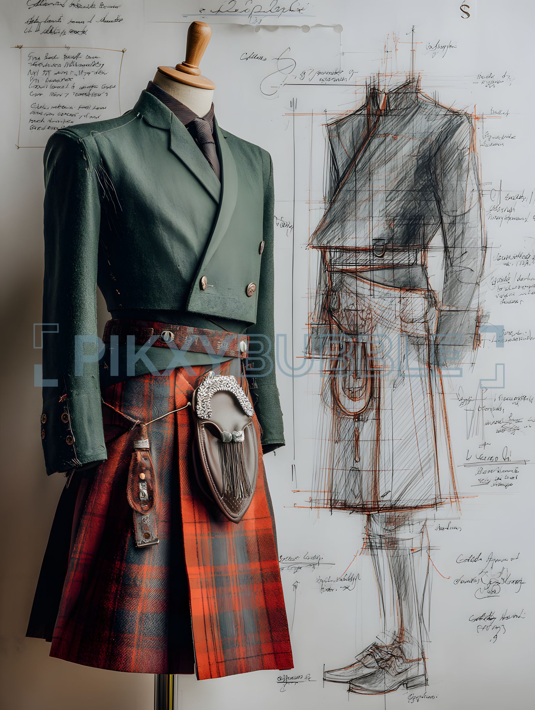 Costume Traditionnel Écossais en tissu de laine avec un kilt caritatif. Ce modèle se distingue par :
