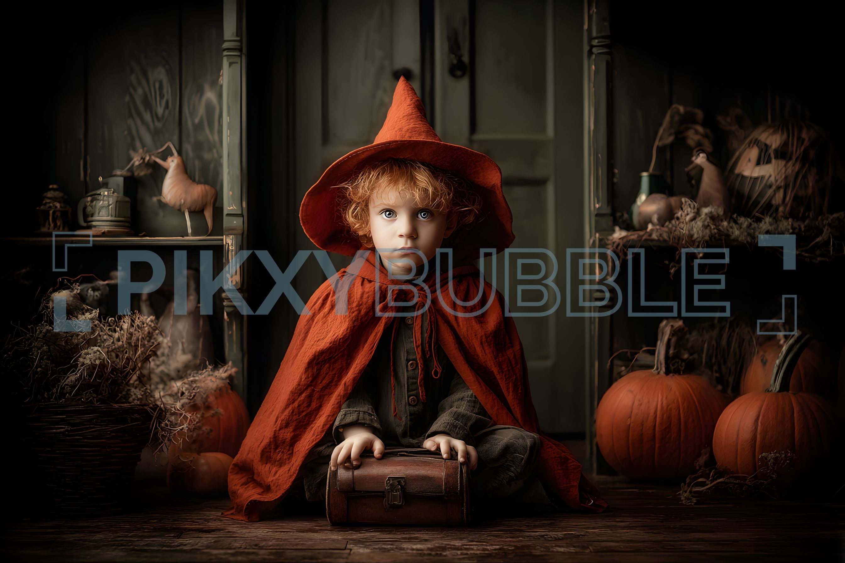 Un jeune sorcier assis parmi les citrouilles et les accessoires d'Halloween.