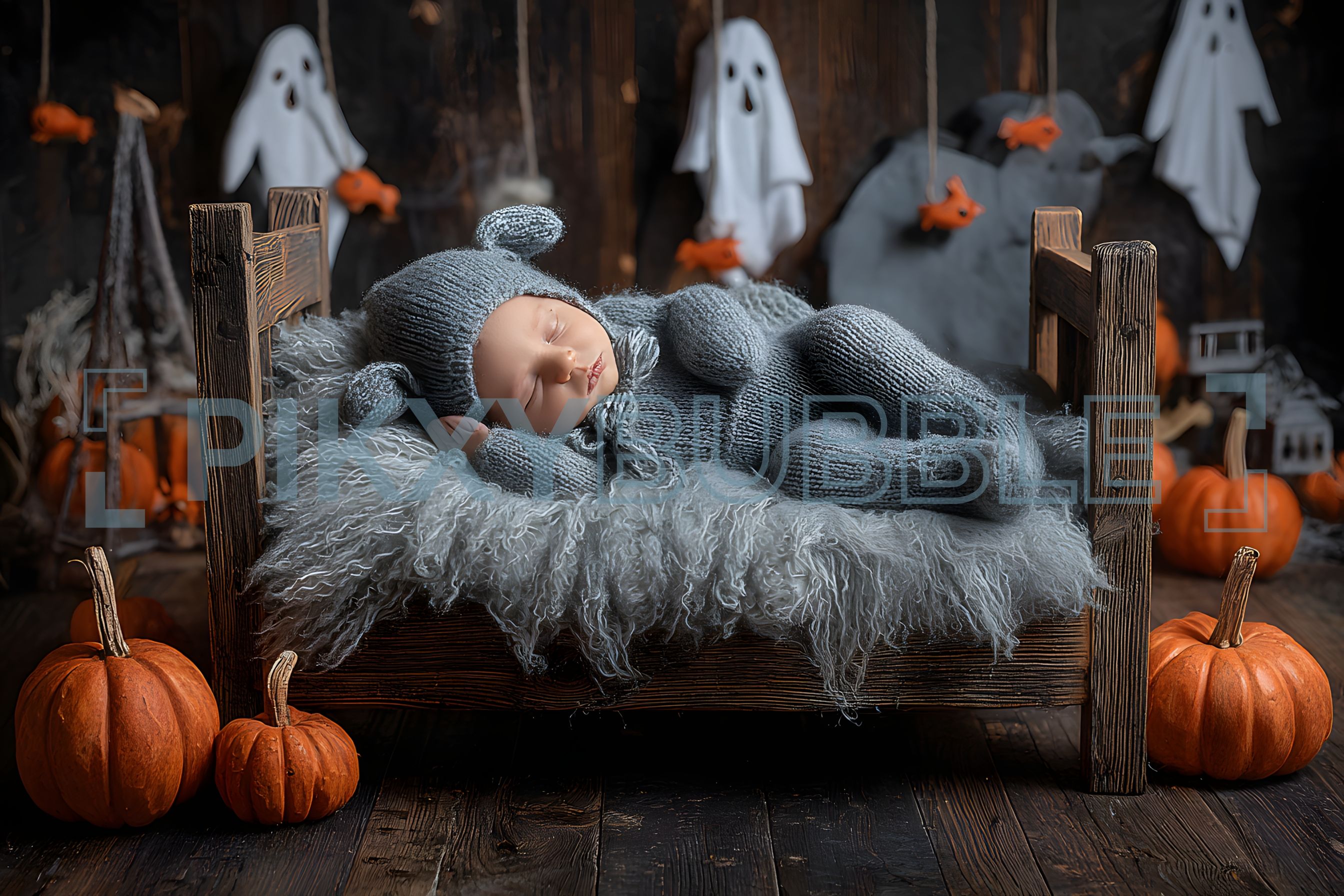 Un adorable décor d'Halloween avec une poupée endormie. Les éléments incluent :