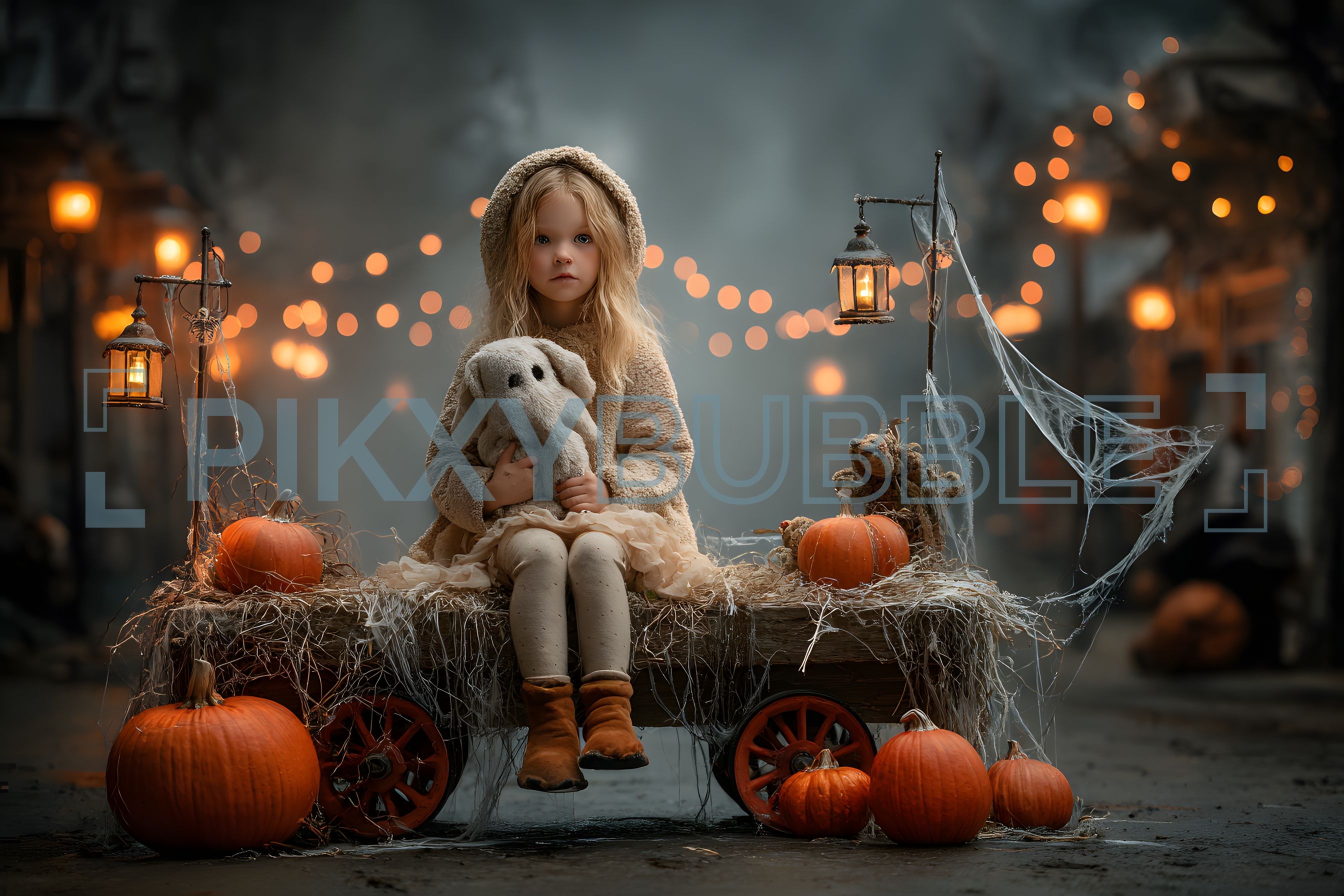 Découvrez l'ambiance mystérieuse de notre fête d'Halloween avec une petite fille au regard captivant. Les citrouilles, lanternes et décorations en toile d'araignée ajoutent une touche féerique. Voici ce que vous y trouverez :