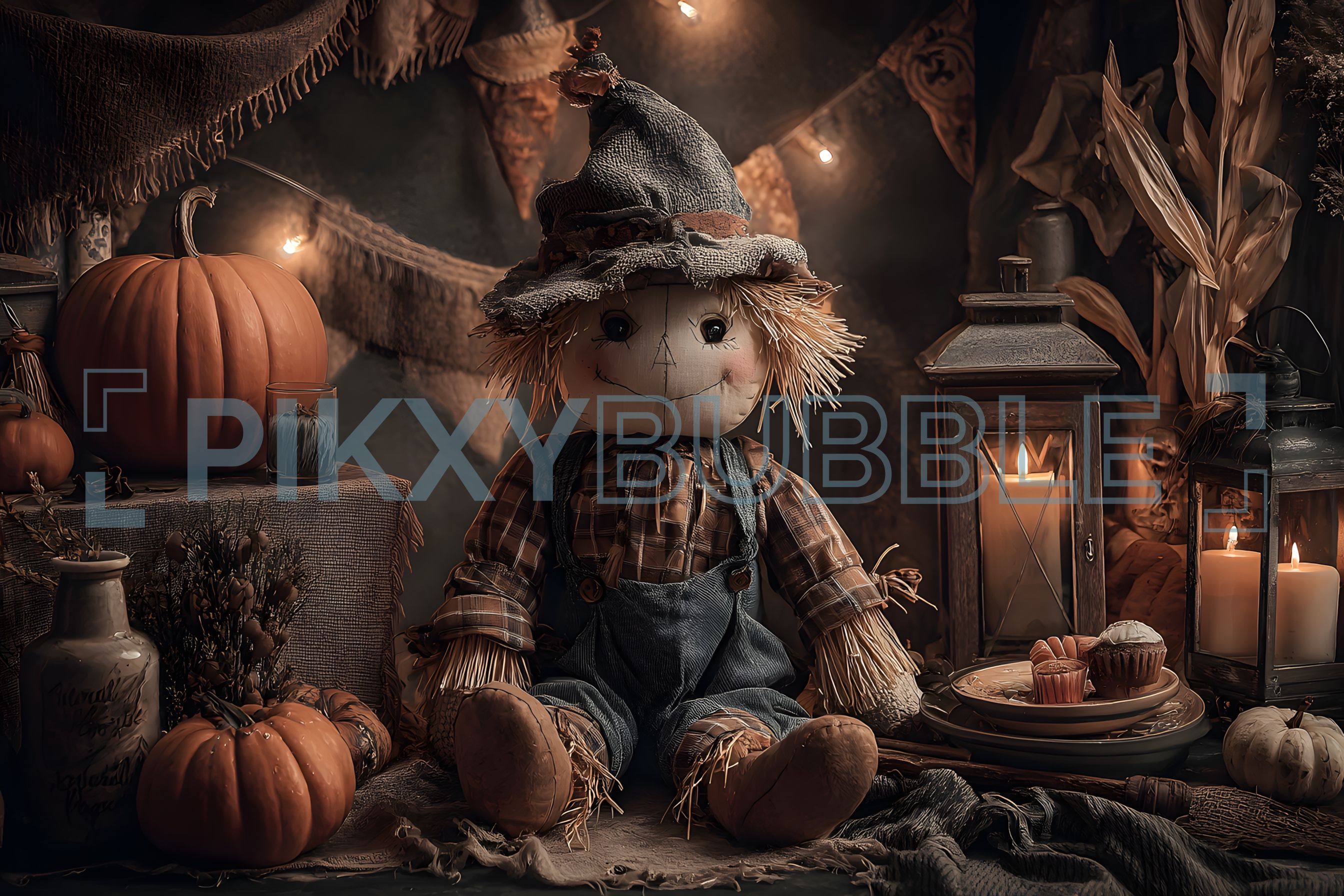 Poupée de foin décorative pour l'automne : une belle scène d'Halloween avec des citrouilles et des bougies. Créez une ambiance chaleureuse et festive dans votre maison !