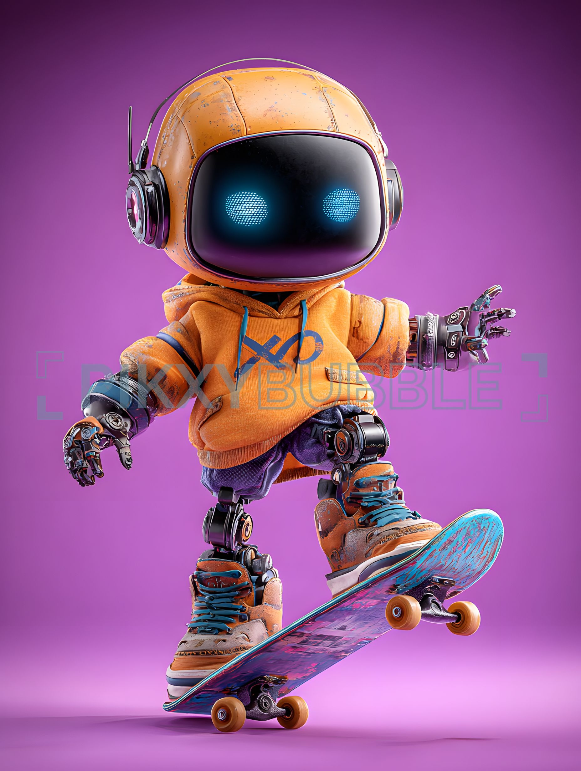 Robot skateur sur un skateboard vibrant et dynamique. Voici quelques points clés :