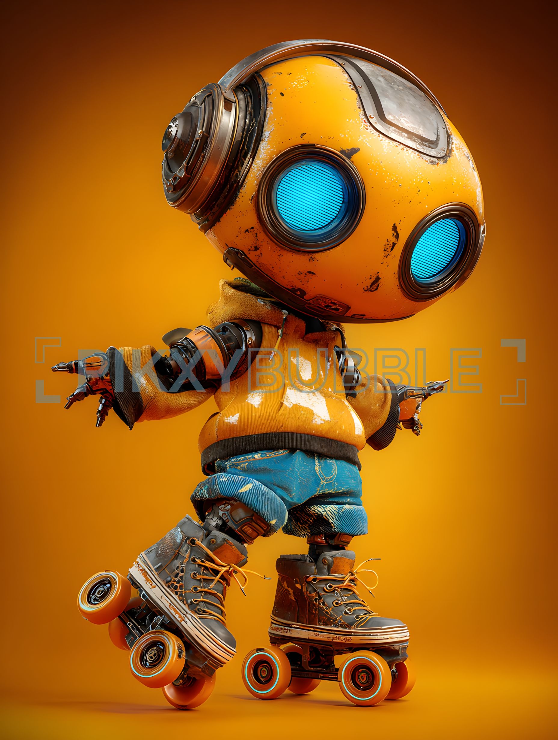 Voici un robot amusant qui adore les patins à roulettes. Il porte une veste colorée et des pantalons en denim.