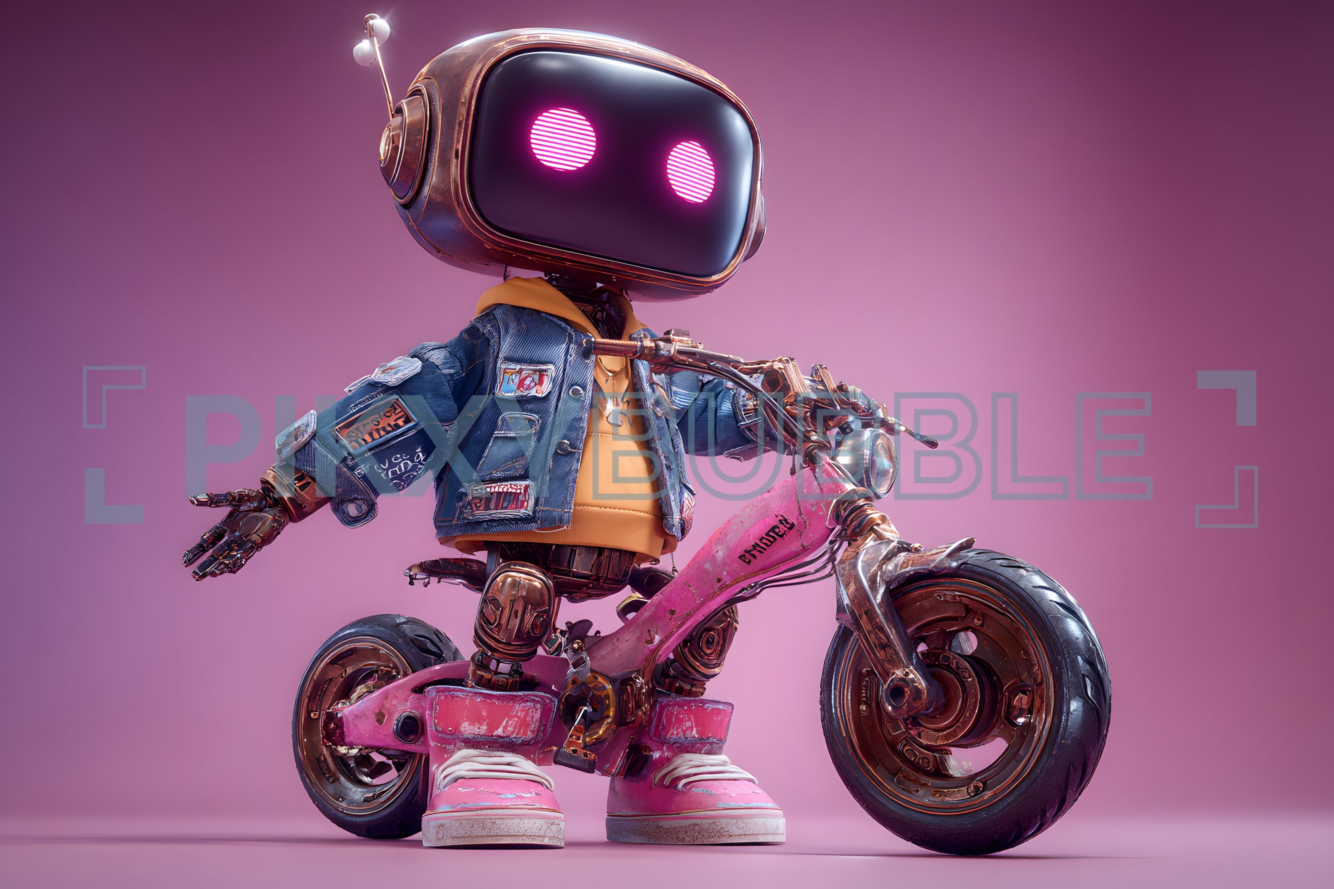 Ce personnage unique est conçu pour capter l'attention. Il porte une veste en denim ornée de nombreux patchs colorés. Dans cet univers futuriste, il est représenté sur
