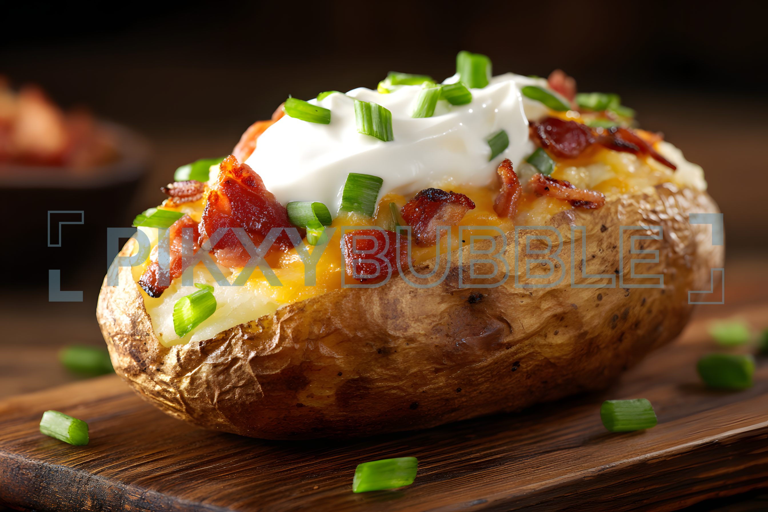Découvrez une recette délicieuse de pomme de terre au four, garnie de crème aigre, fromage et lardons.