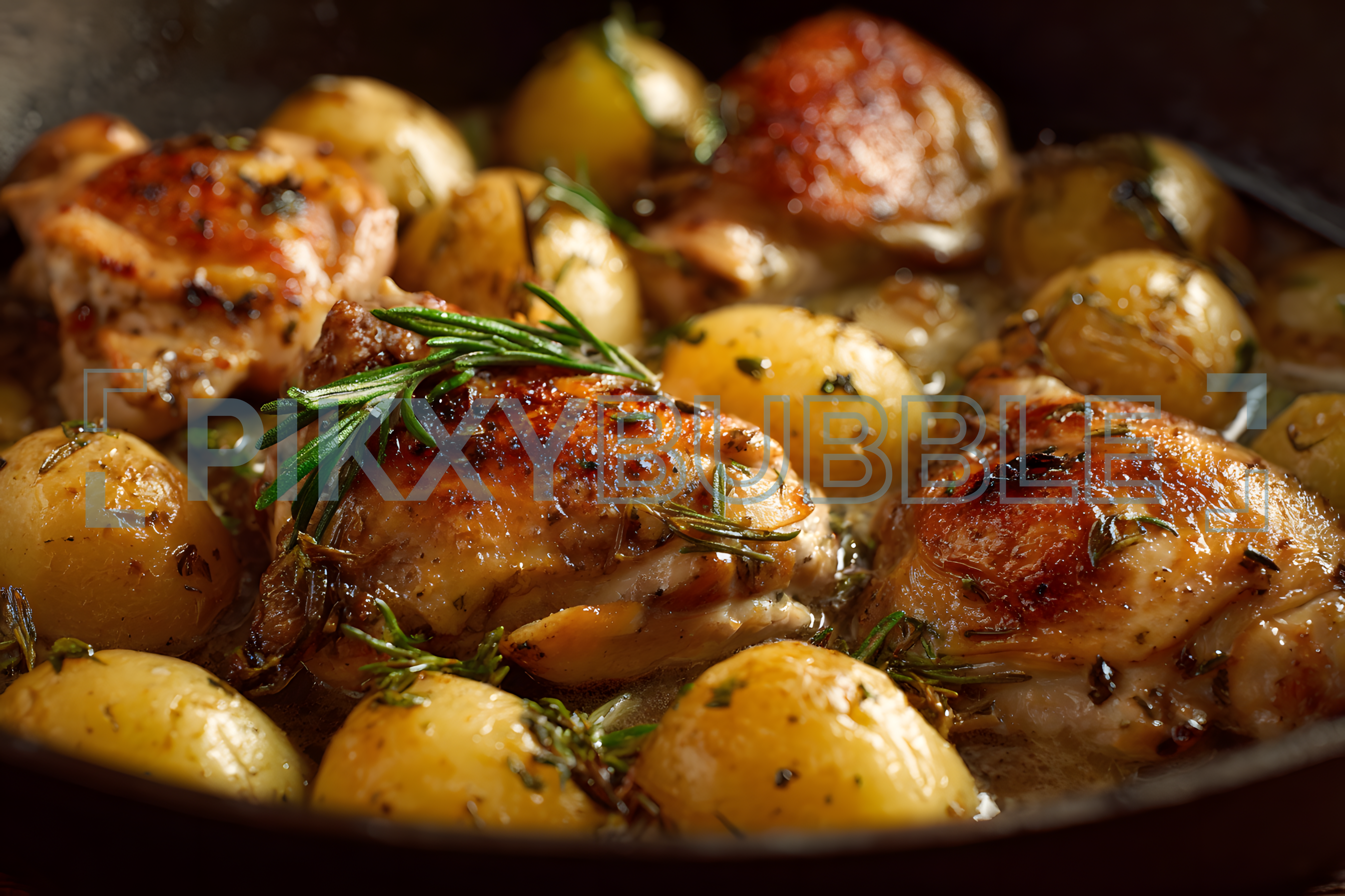 Délicieux poulet rôti accompagné de pommes de terre tendres.