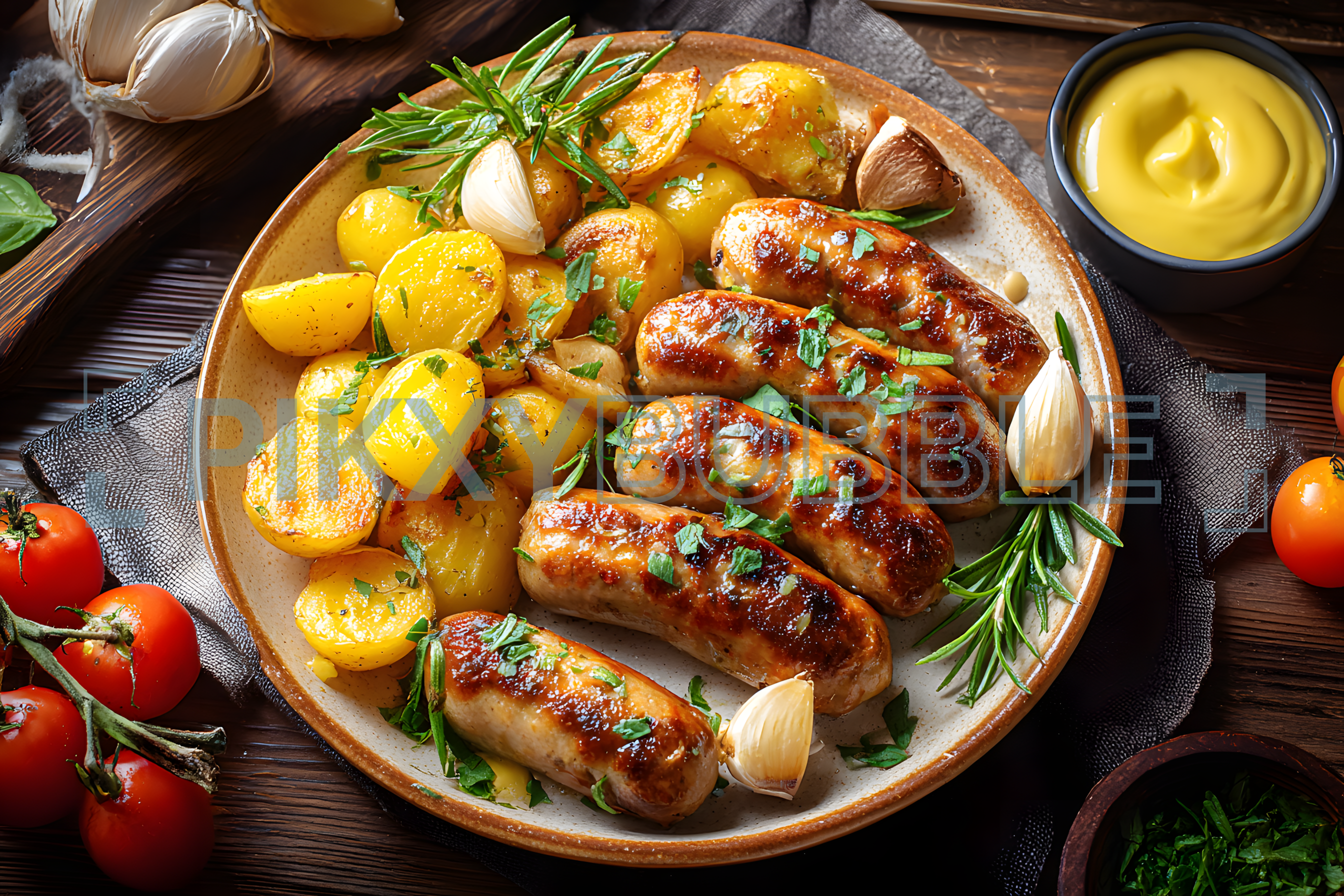Délicieuse assiette de sausages avec des pommes de terre dorées.