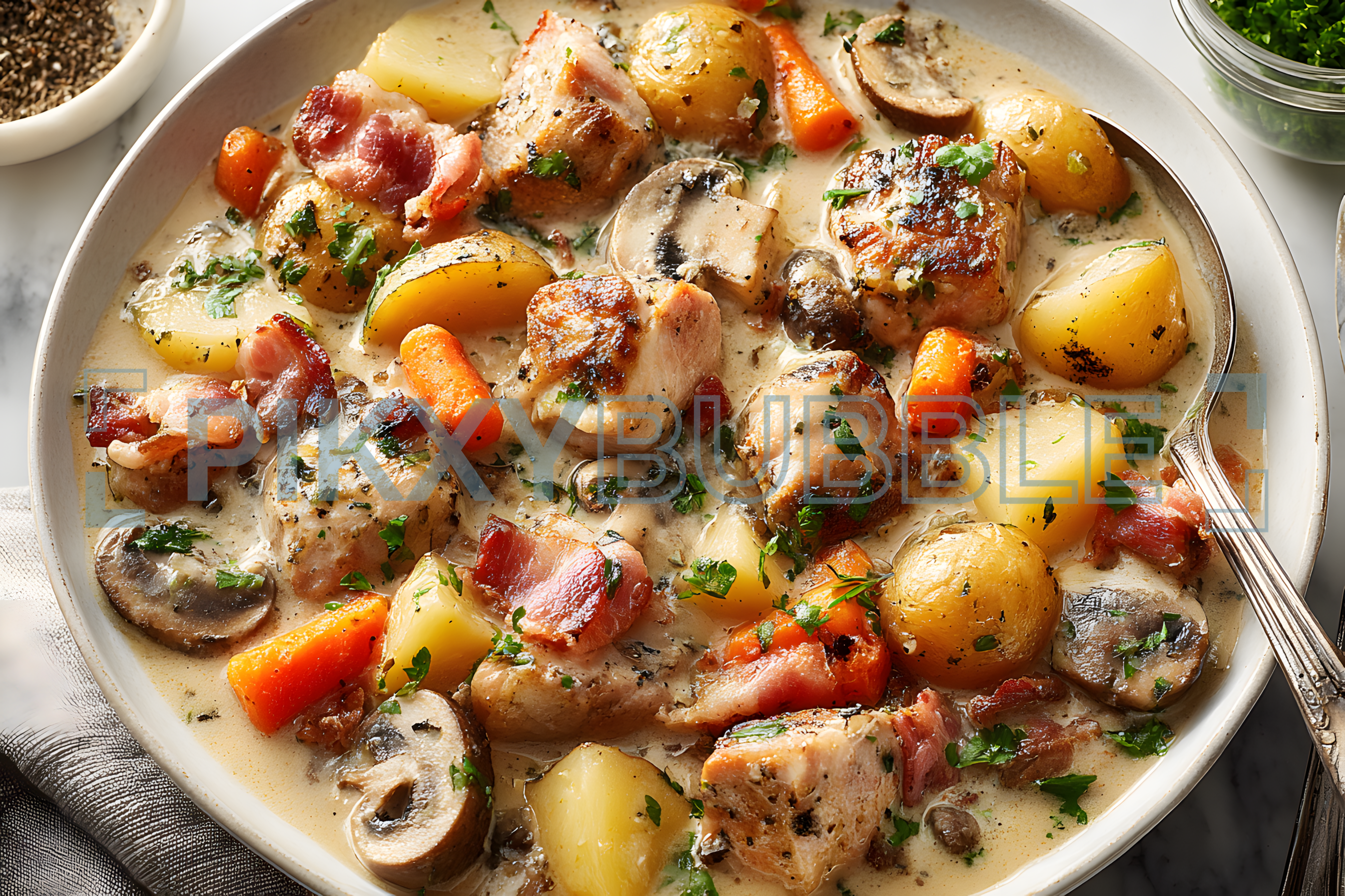 Un délicieux ragoût de poulet avec des légumes variés et une sauce crémeuse. Voici ce que vous y trouverez :