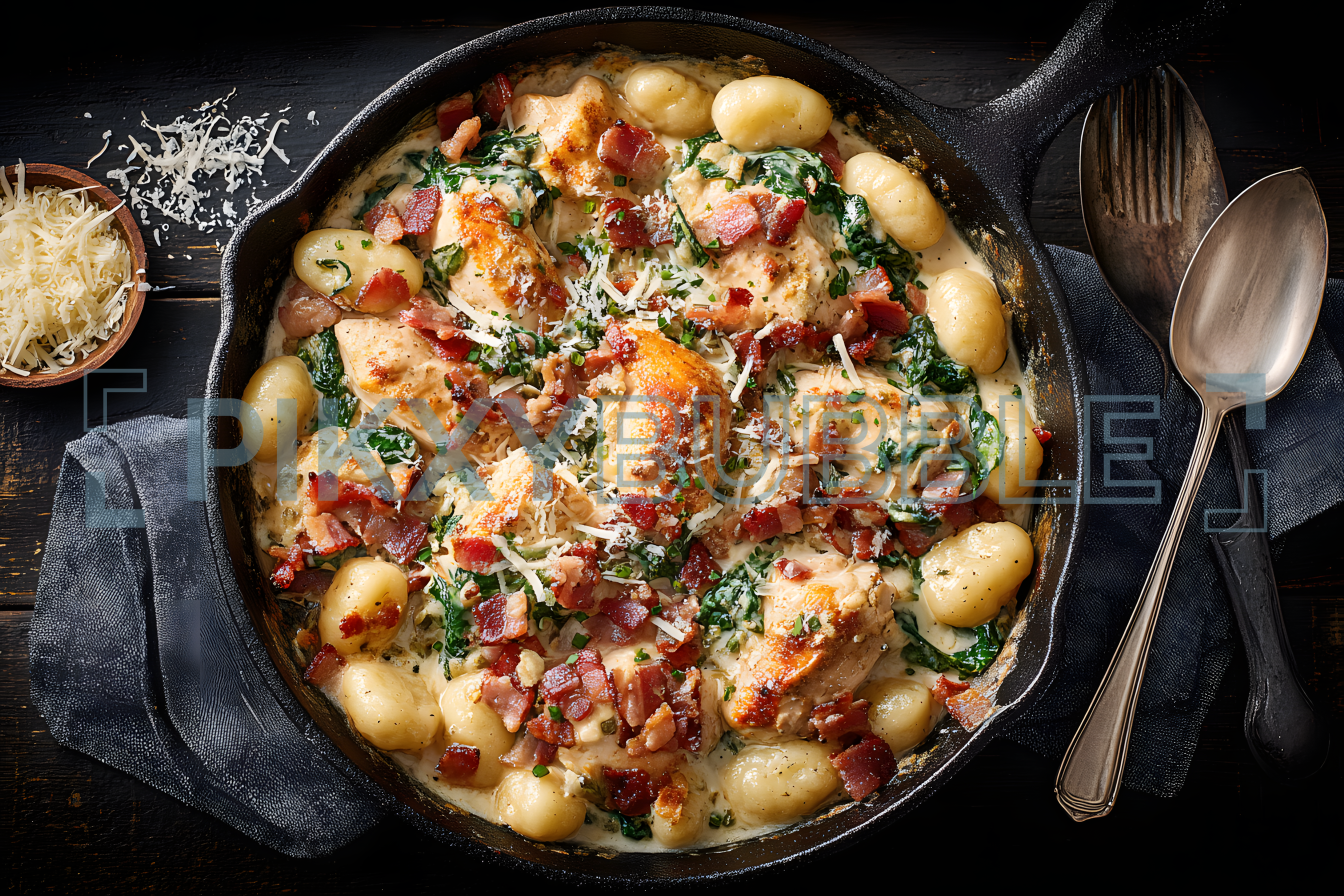 Découvrez cette délicieuse recette de gnocchis avec du poulet, des épinards et du bacon!