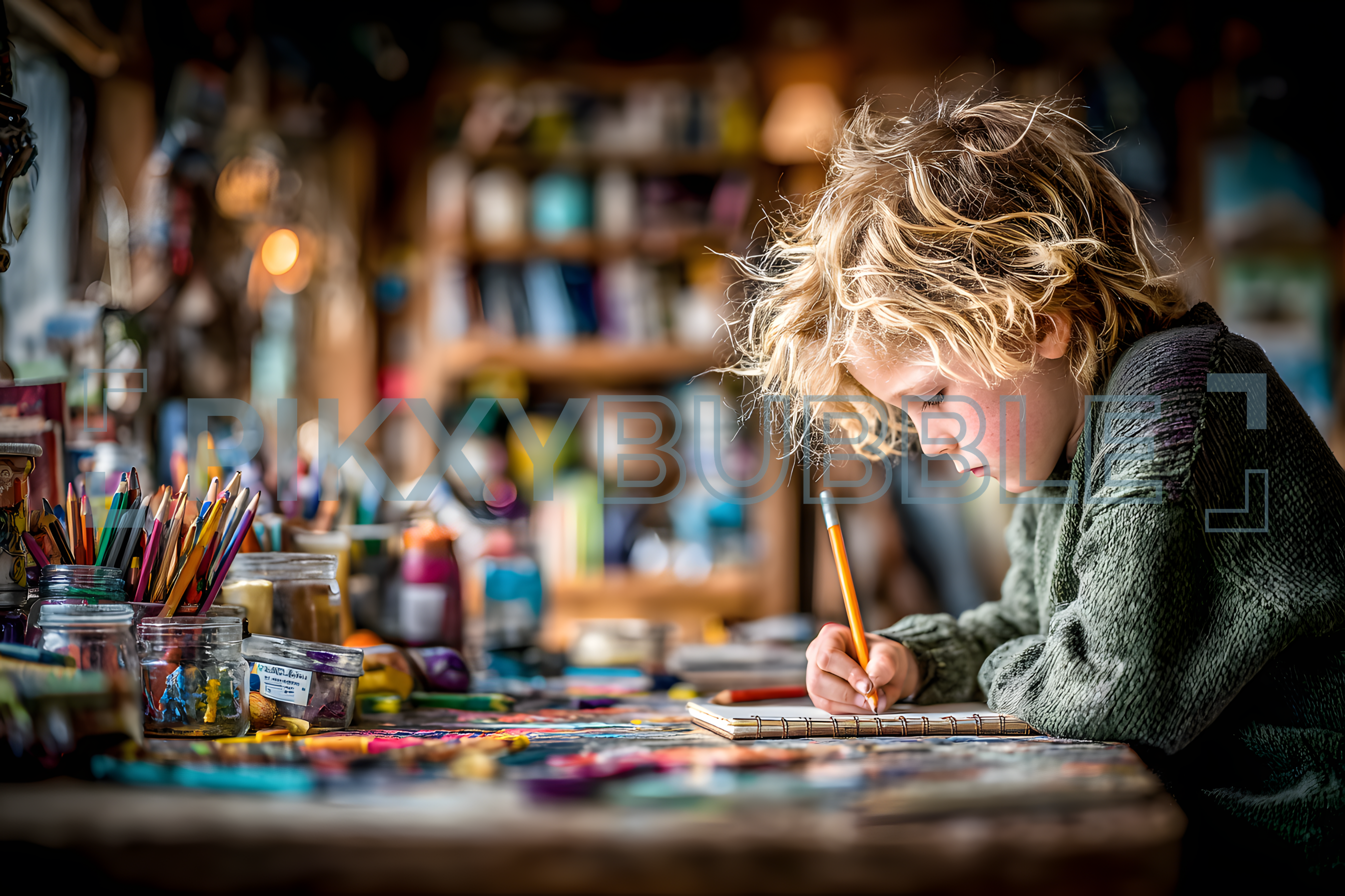 Un jeune artiste en herbe est plongé dans son carnet de croquis. Dans cet espace créatif, on peut apercevoir :