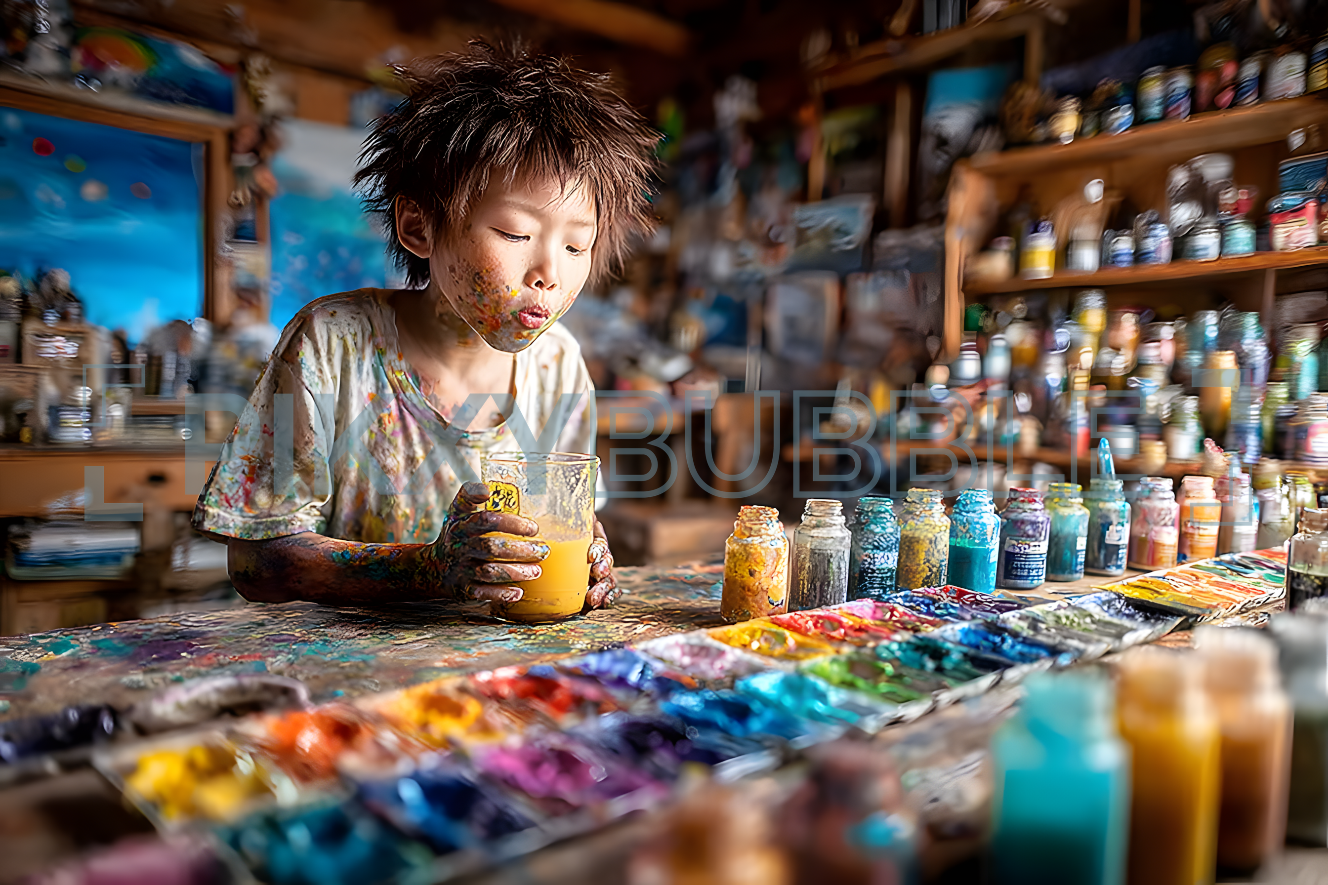 Un jeune artiste s'exprime à travers la peinture. Son visage est couvert de couleurs, symbolisant
