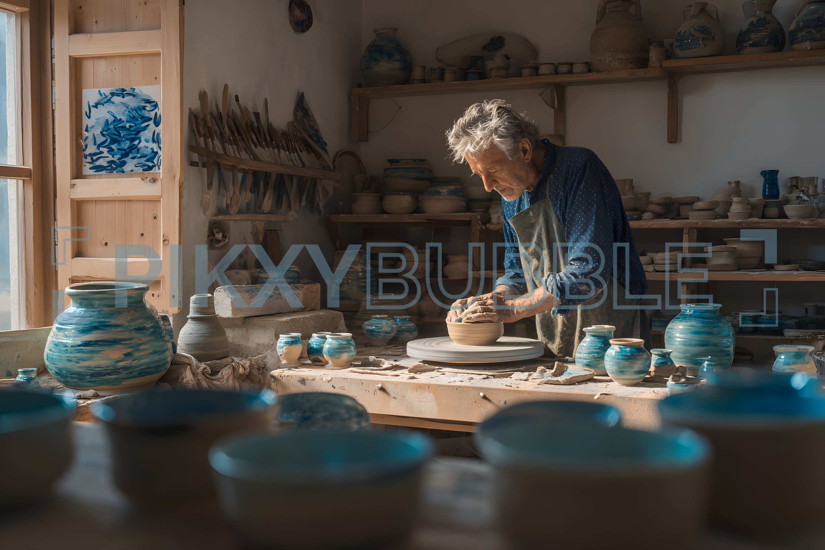Dans cet atelier de pottery, un artisan talentueux façonne des pièces en terre cuite. Les murs sont ornés de