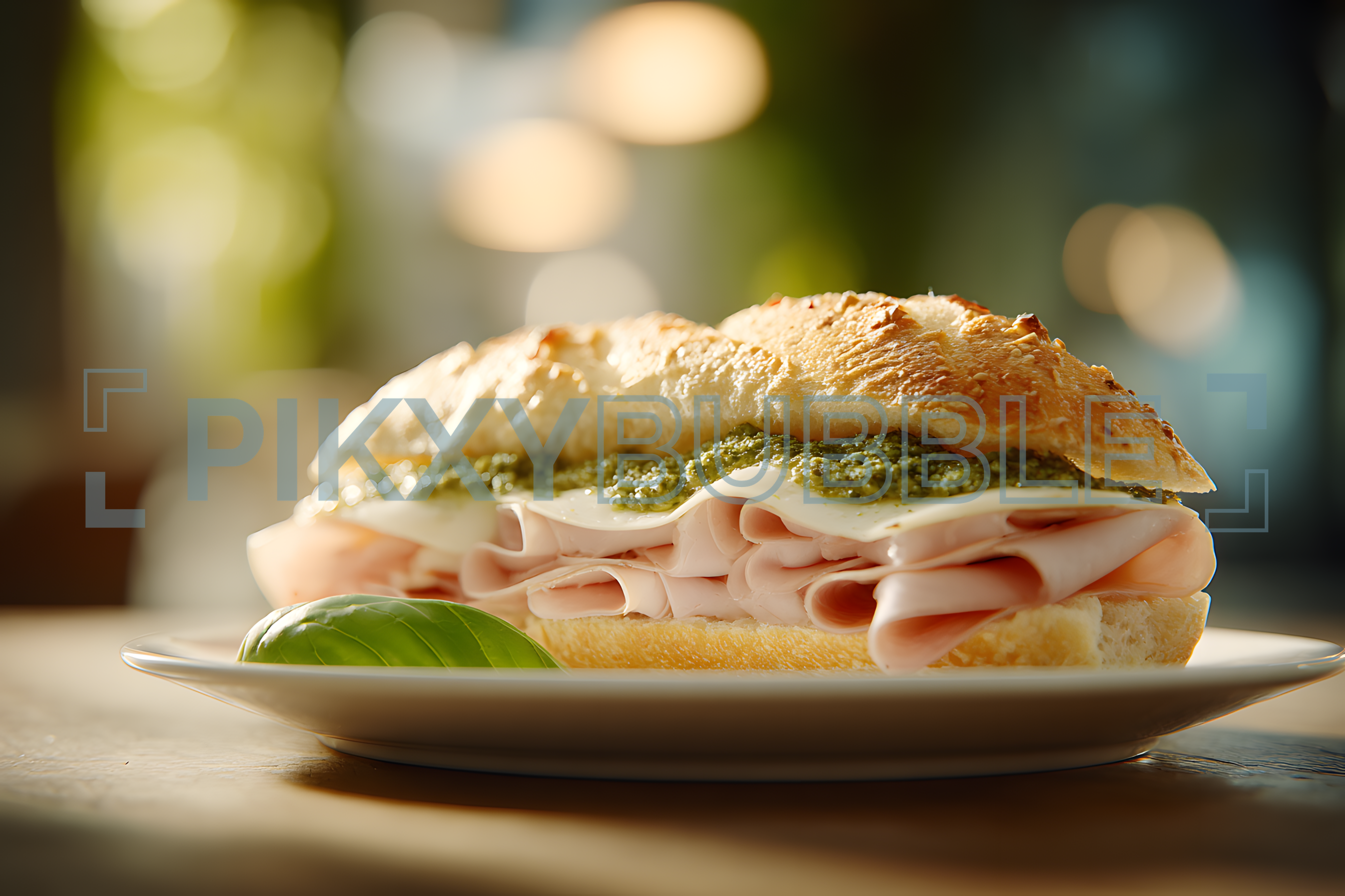 Délicieux sandwich préparé avec des ingrédients frais. Ce sandwich est composé de jambon, de fromage, et d'une sauce au pesto savoureuse.