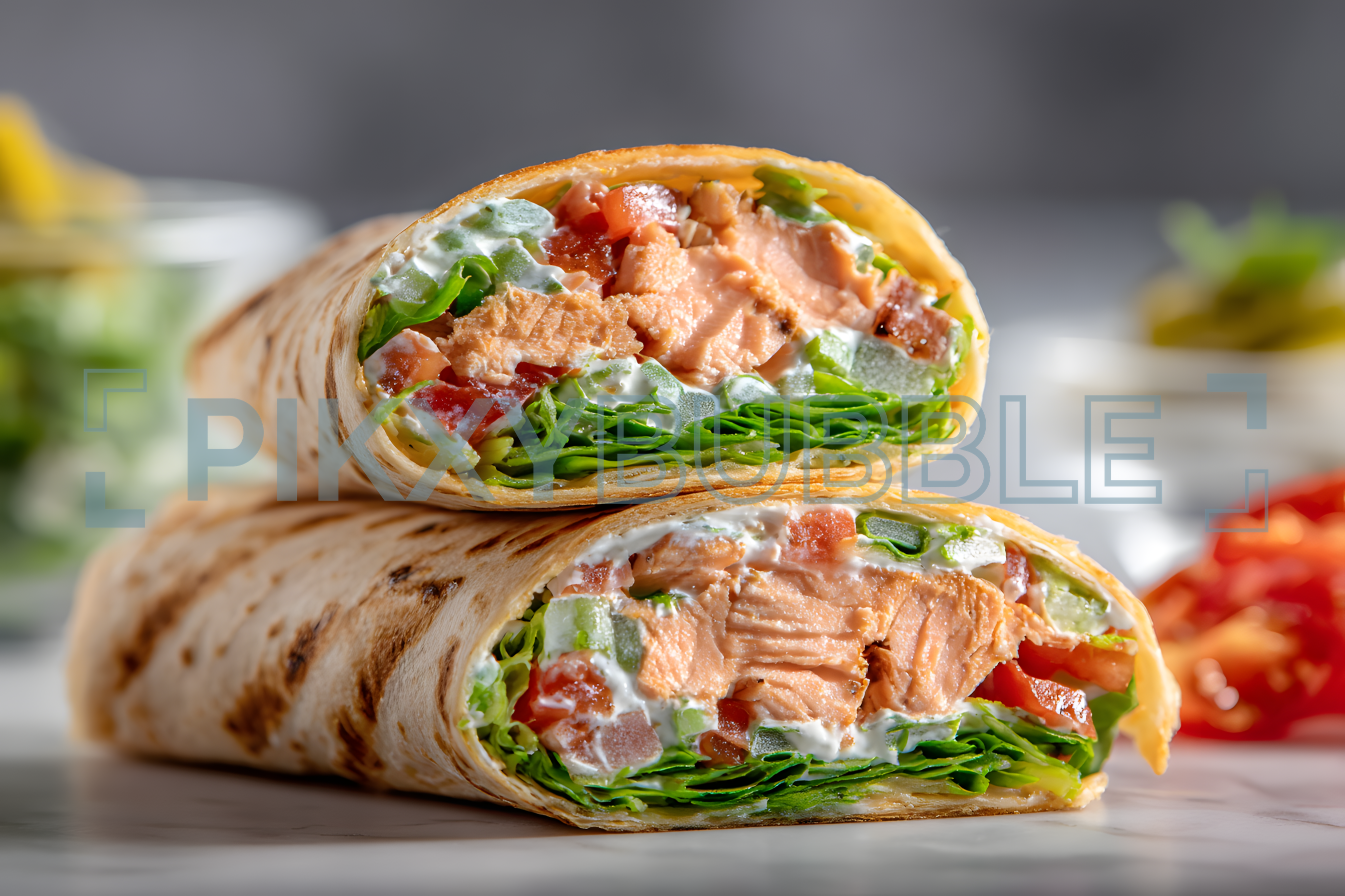 Découvrez notre savoureux wrap au saumon, rempli de légumes frais et d'une délicieuse sauce crémeuse.