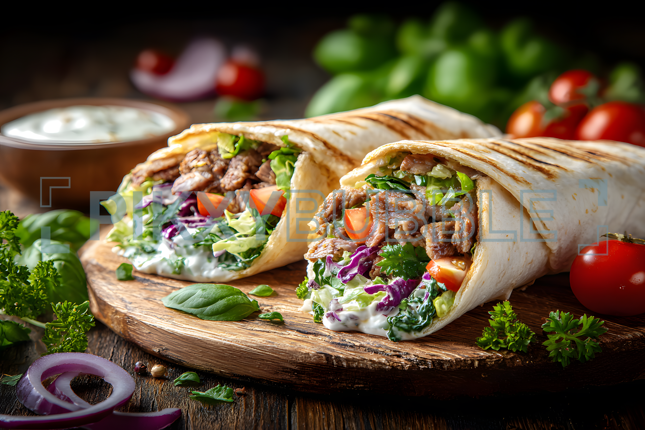 Délicieux wraps de viande avec légumes frais et sauce onctueuse.