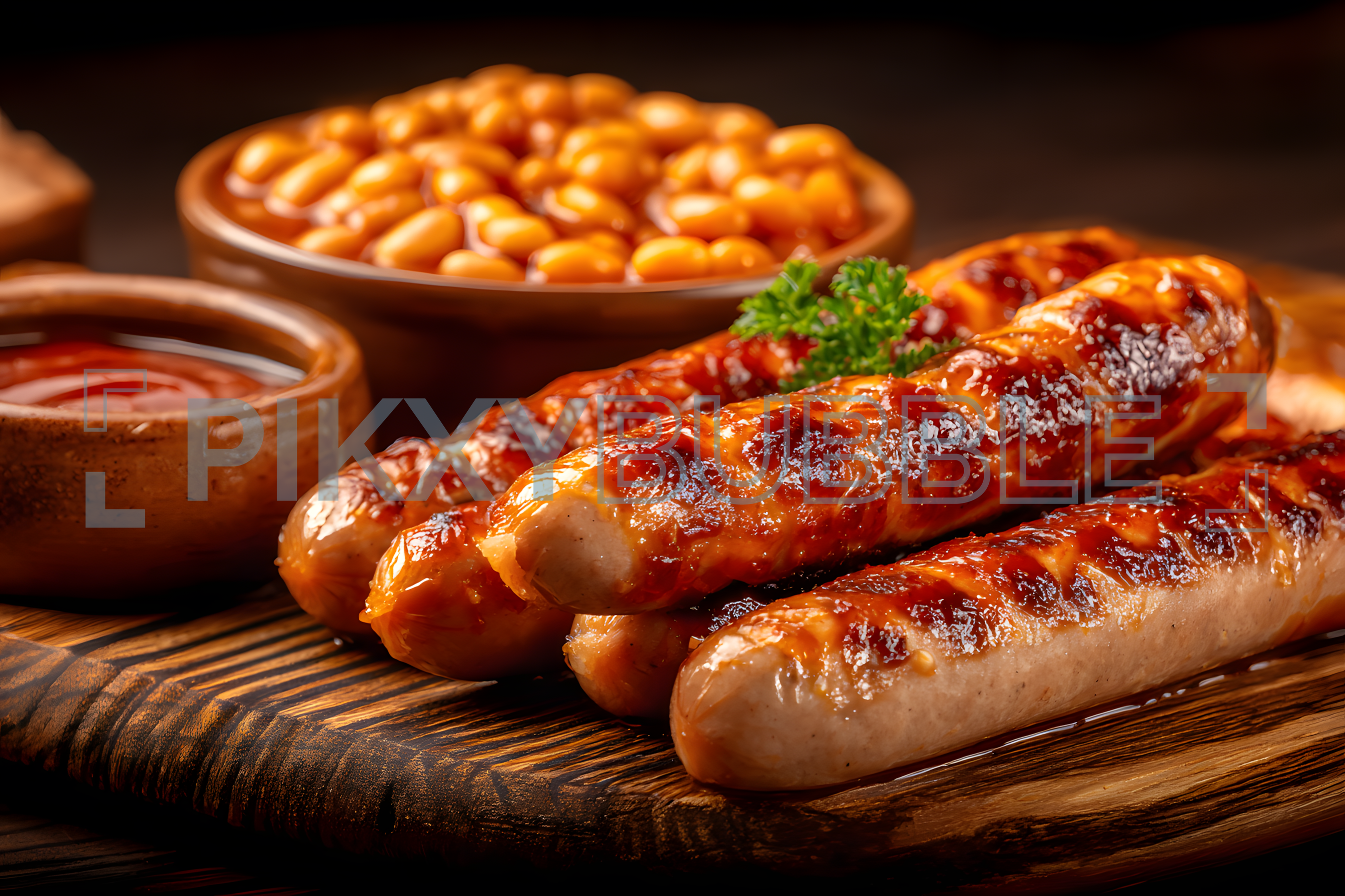 Dégustez nos délicieuses saucisses grillées, accompagnées de haricots en sauce et d'une onctueuse sauce barbecue.