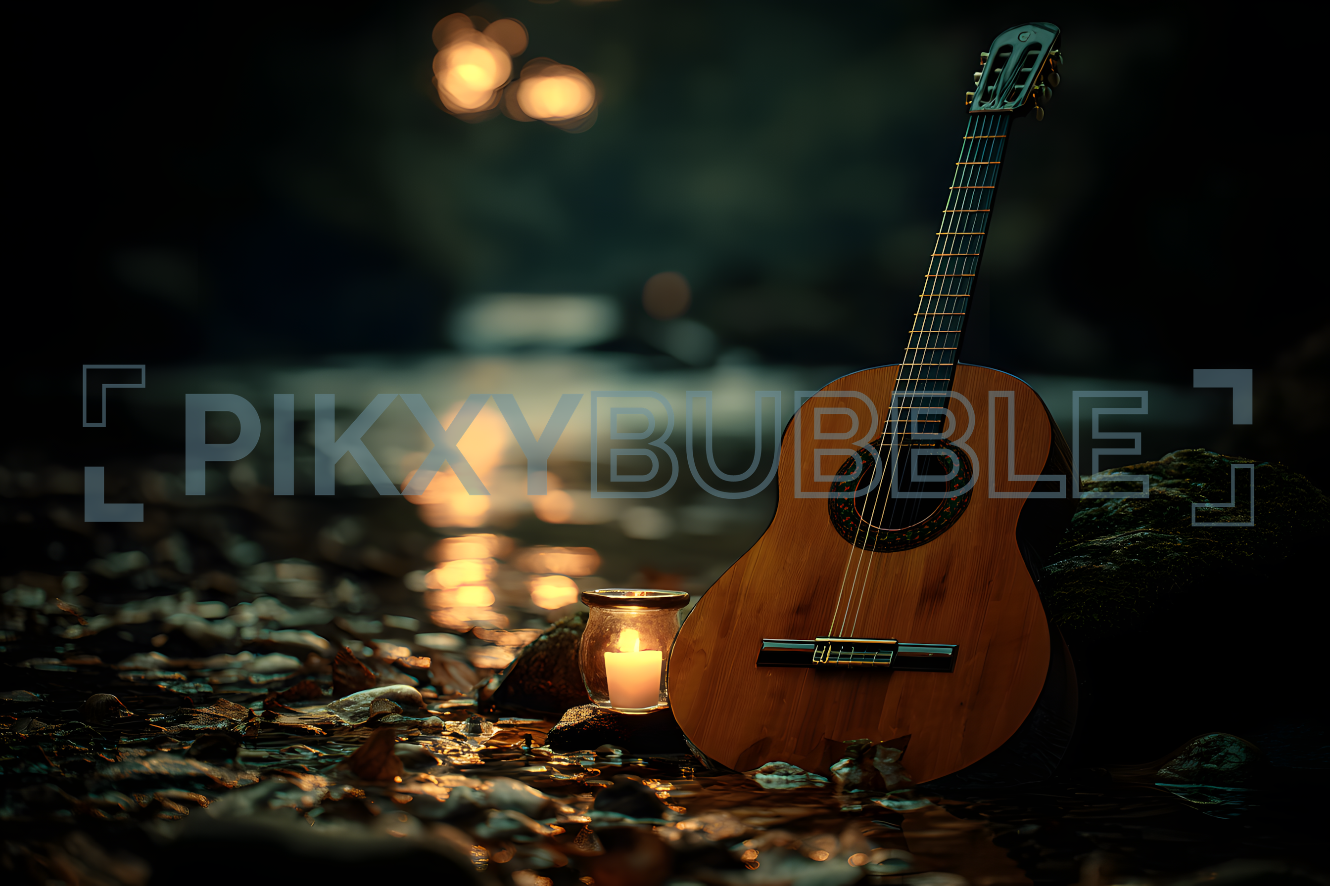Découvrez la beauté d'une guitare acoustique posée au bord de l'eau, entourée de nature. Voici quelques points clés :