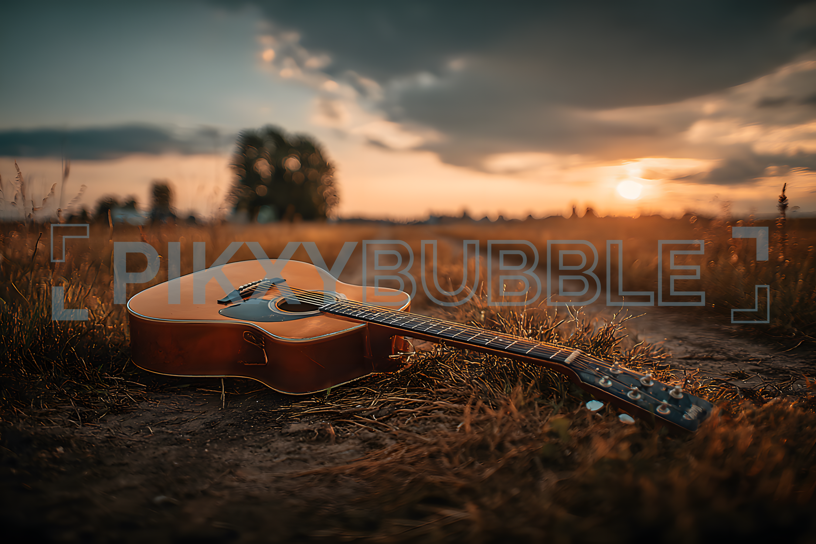 Guitare acoustique posée sur l'herbe, baignée dans la lumière dorée du crépuscule.