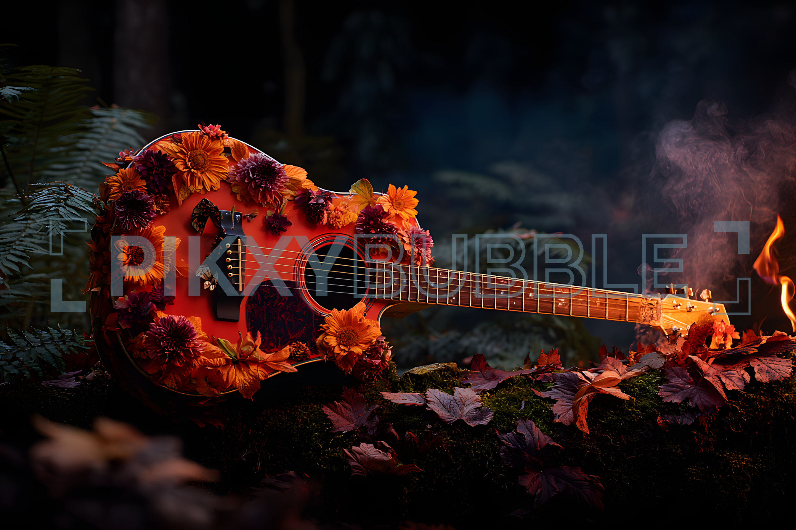 Guitare Écologique décorée avec des fleurs vibrantes pour une touche artistique.