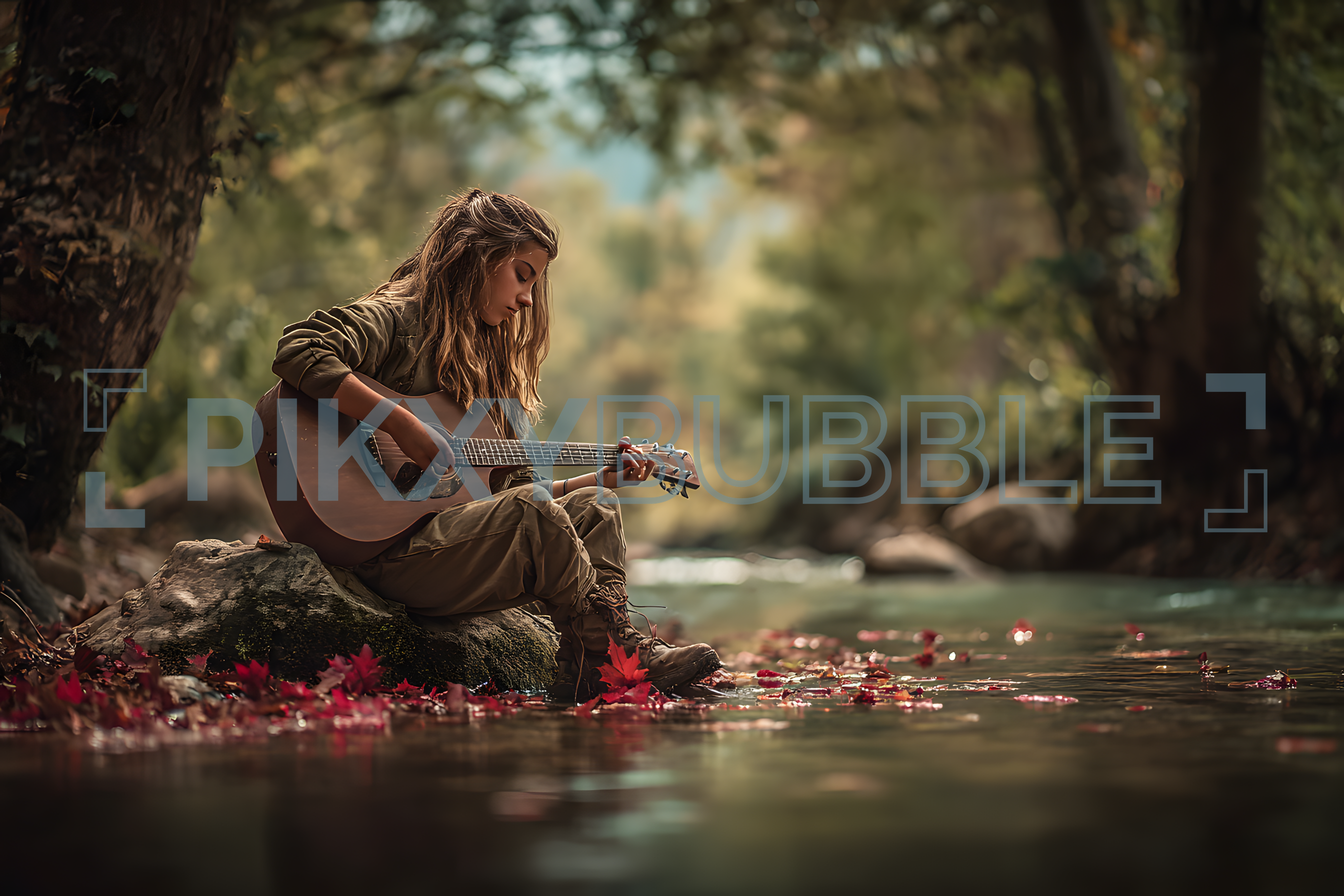 Découvrez la beauté de la musique au cœur de la nature. Une jeune artiste joue de la guitare au bord d'une rivière paisible.