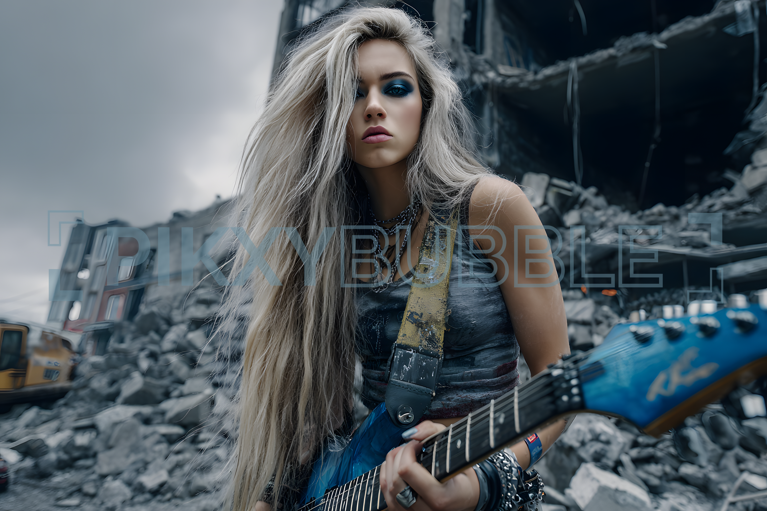 Guitariste rebelle, passionnée de musique, portant une guitare électrique.