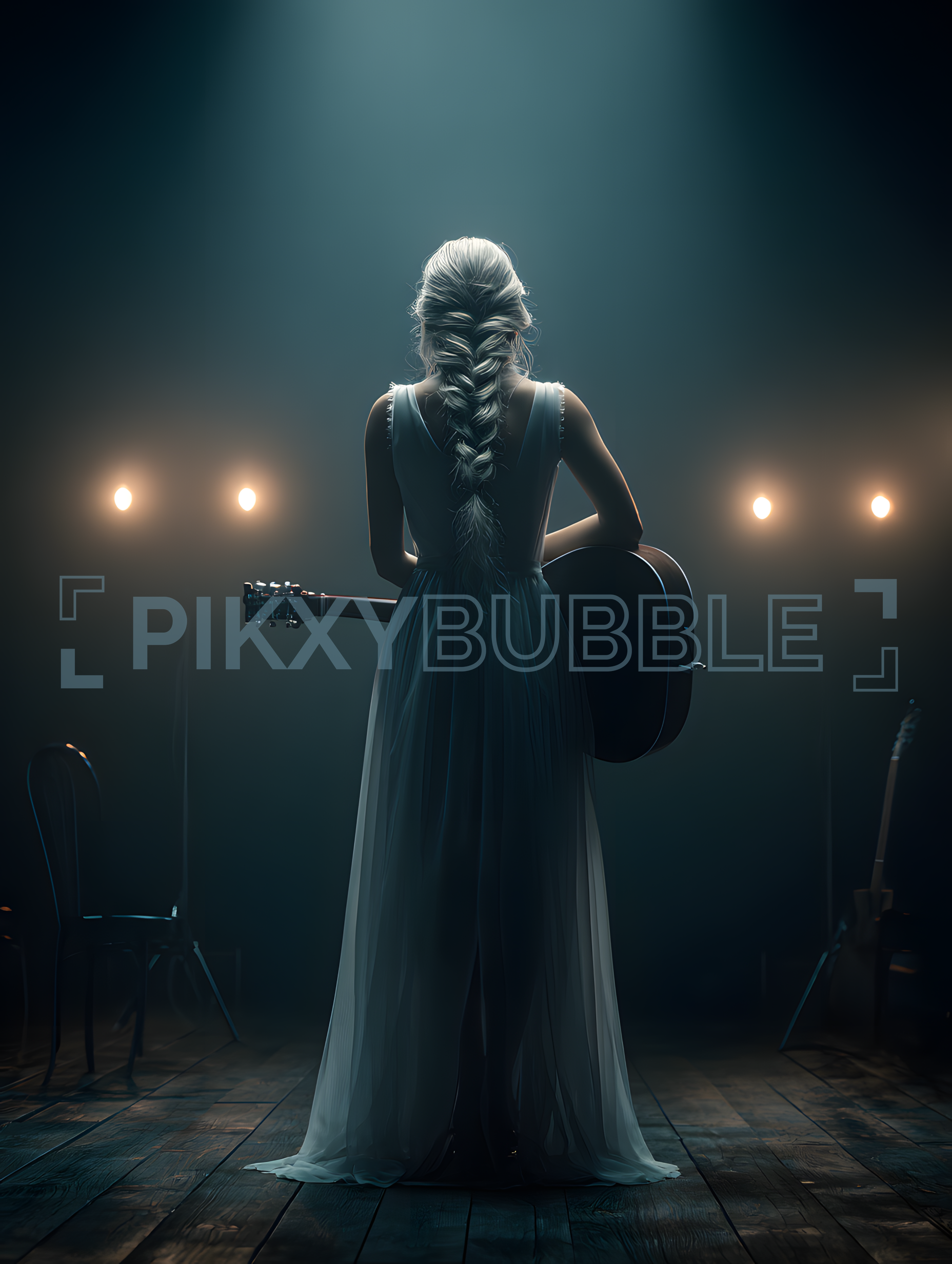 Une artiste se prépare à monter sur scène pour un spectacle inoubliable. La magie de la musique opère dans une ambiance feutrée, avec des lumières tamisées et des ombres dansantes.