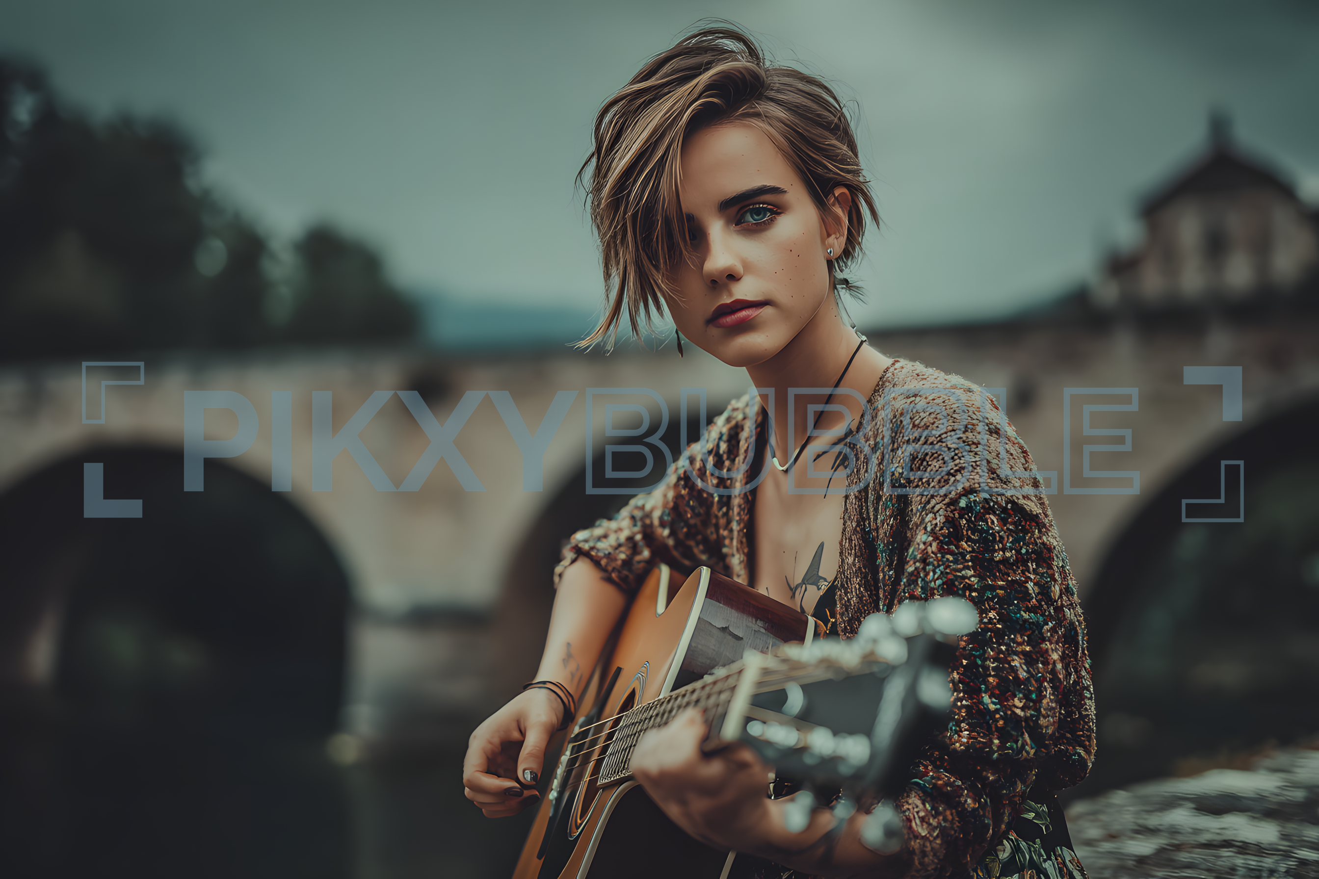 Une musicienne au bord de l'eau, jouant de la guitare.