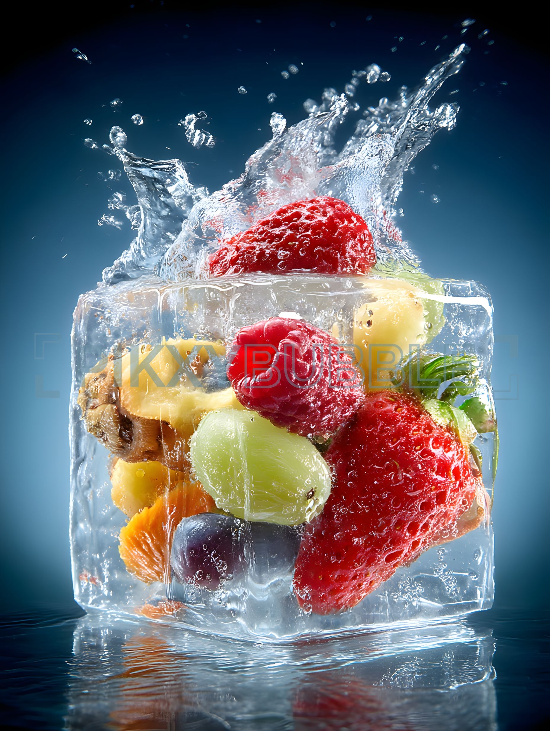 Fruits frais congelés dans un bloc de glace.