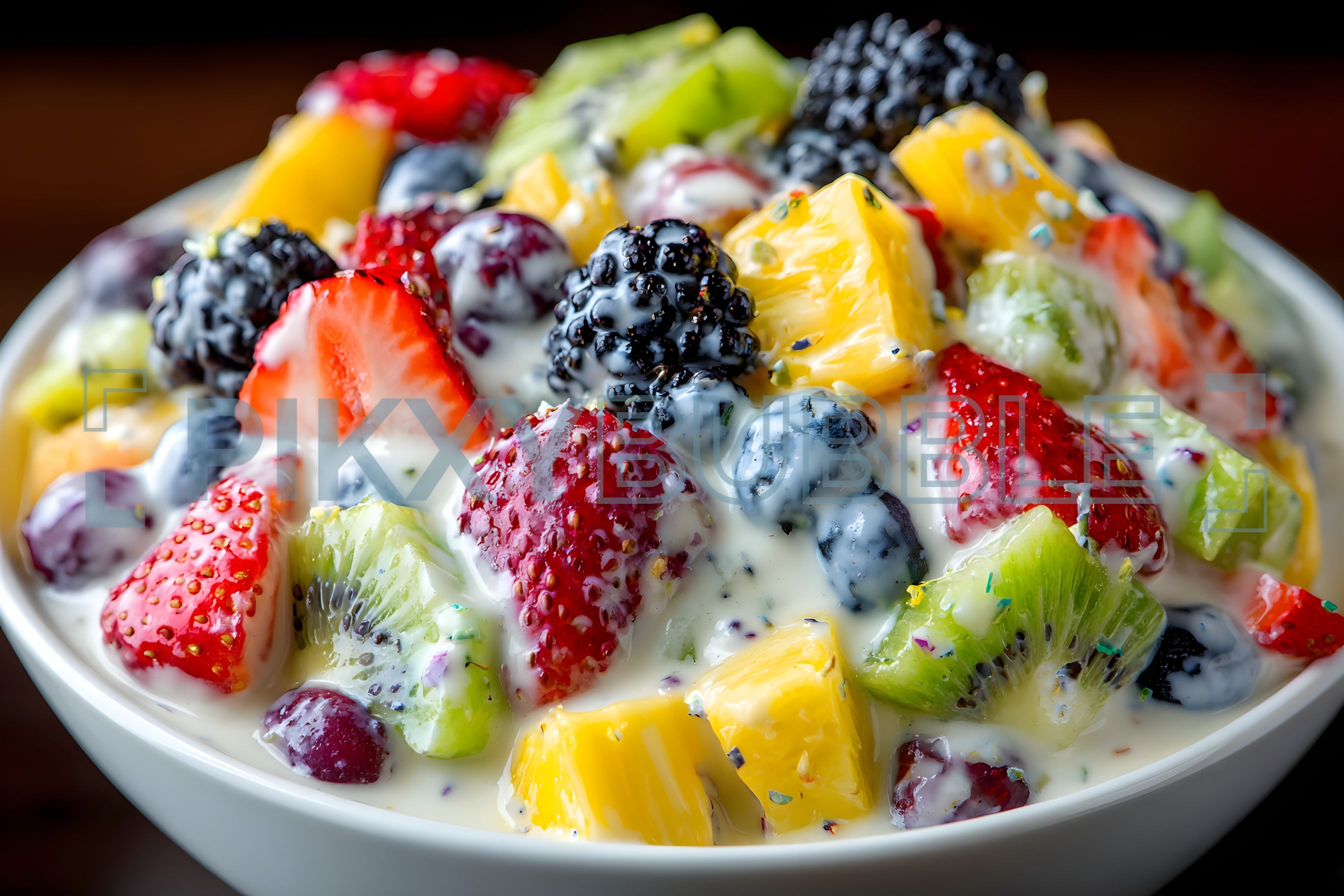 Découvrez notre délicieuse salade de fruits ! Des morceaux de mangue, d'ananas, kiwi et baies frais, servis dans une crème onctueuse.