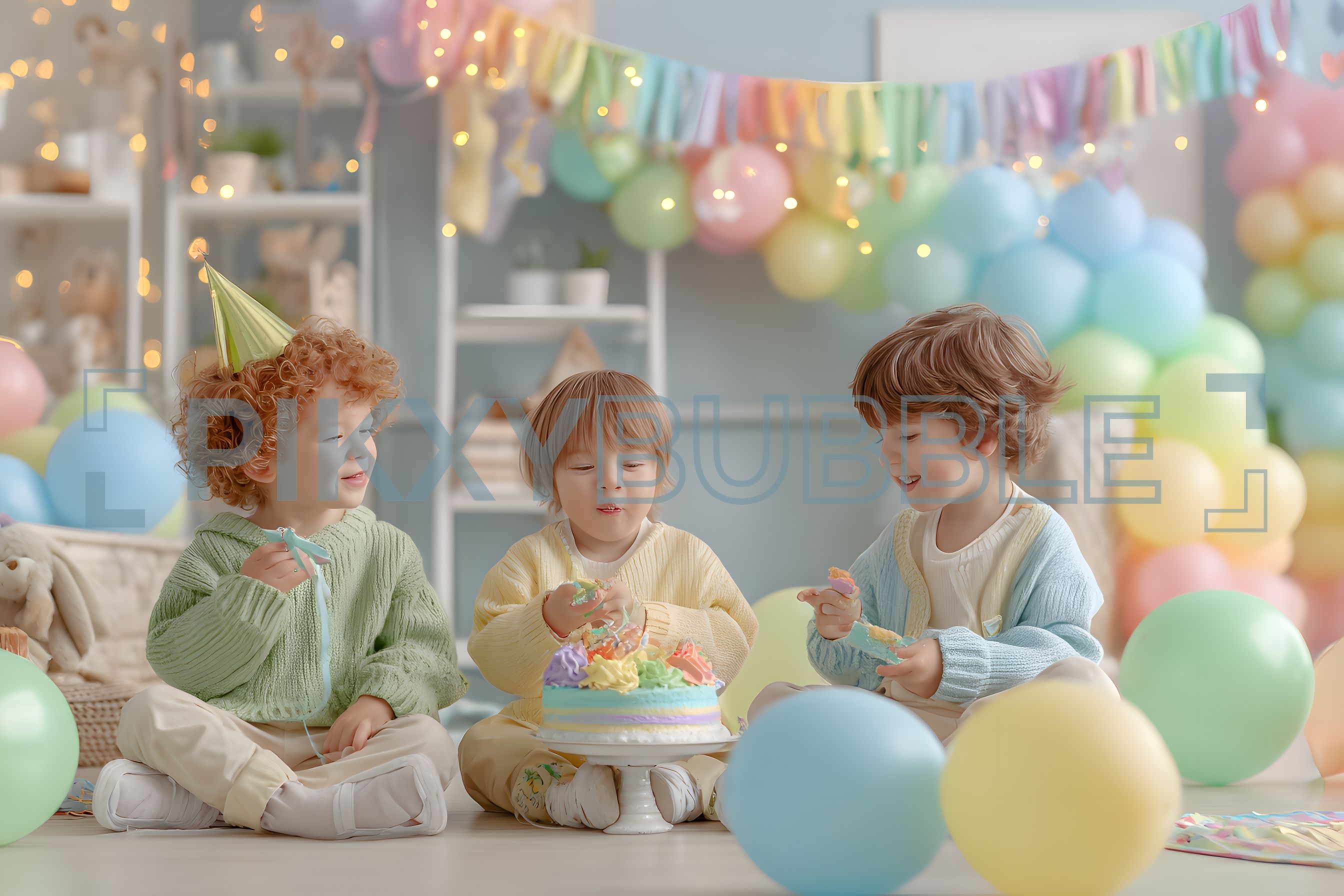 Anniversaire d'enfants avec gâteau et ballons. Voici quelques éléments de la fête :