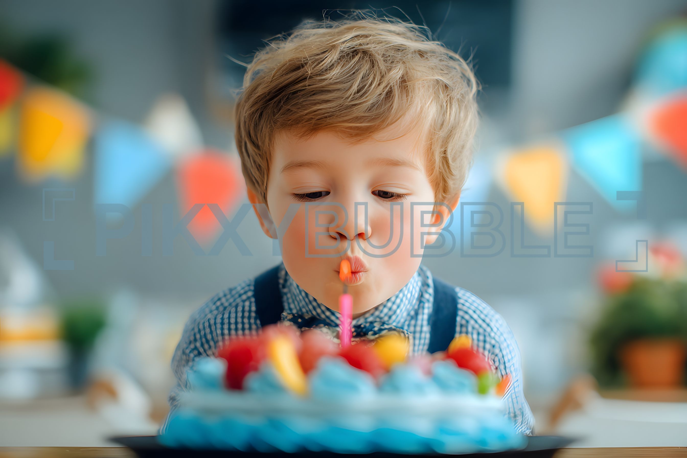 Le petit garçon souffle sa bougie sur un gâteau coloré. Sa joie est palpable !
