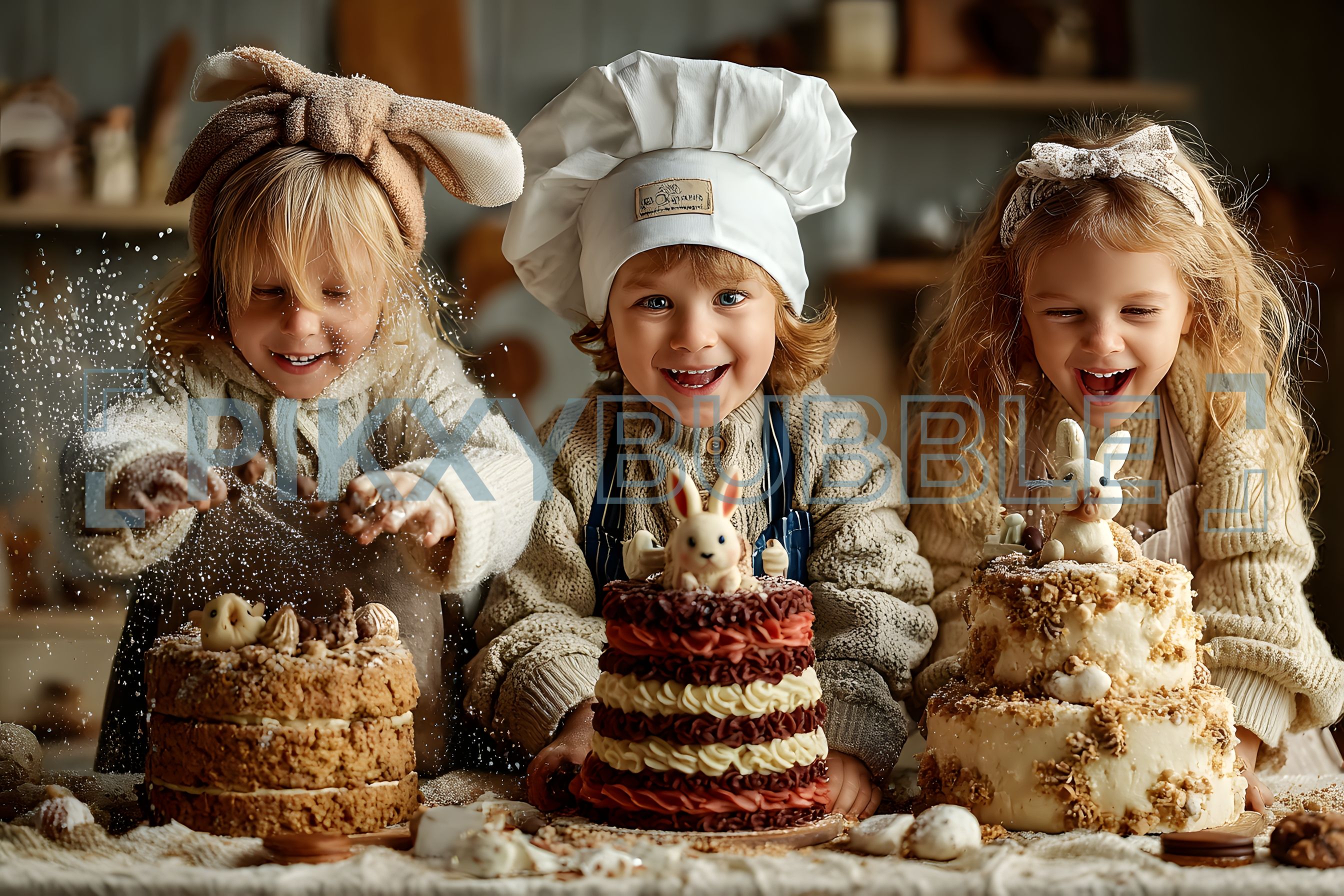 Les petits chefs en herbe! Dans cette illustration, vous pouvez voir des enfants qui s'amusent en cuisinant. Ils portent des accessoires mignons et s'éclaboussent de farine. Voici quelques points à souligner :
