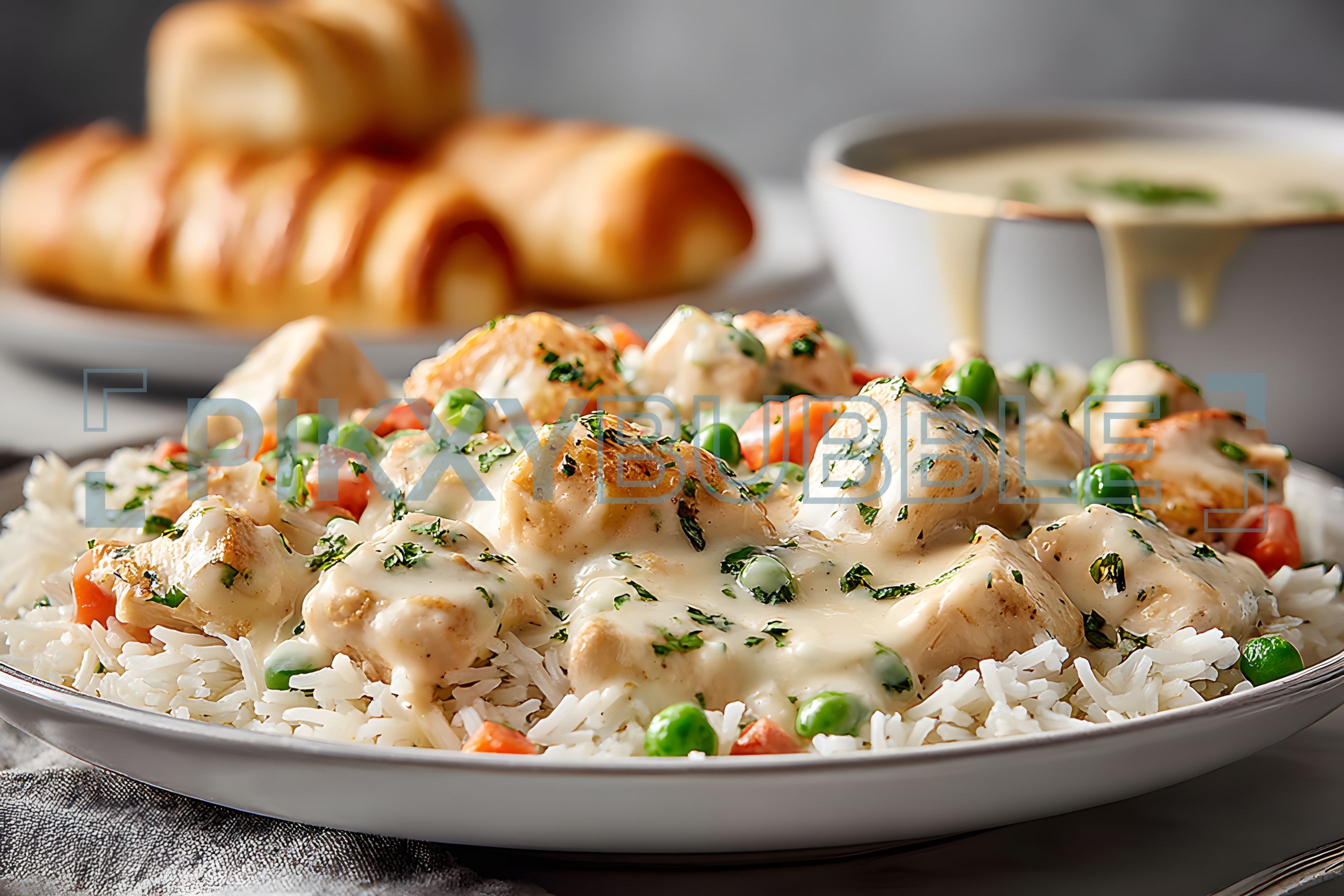 Découvrez notre délicieuse recette de poulet en sauce servi sur un lit de riz.