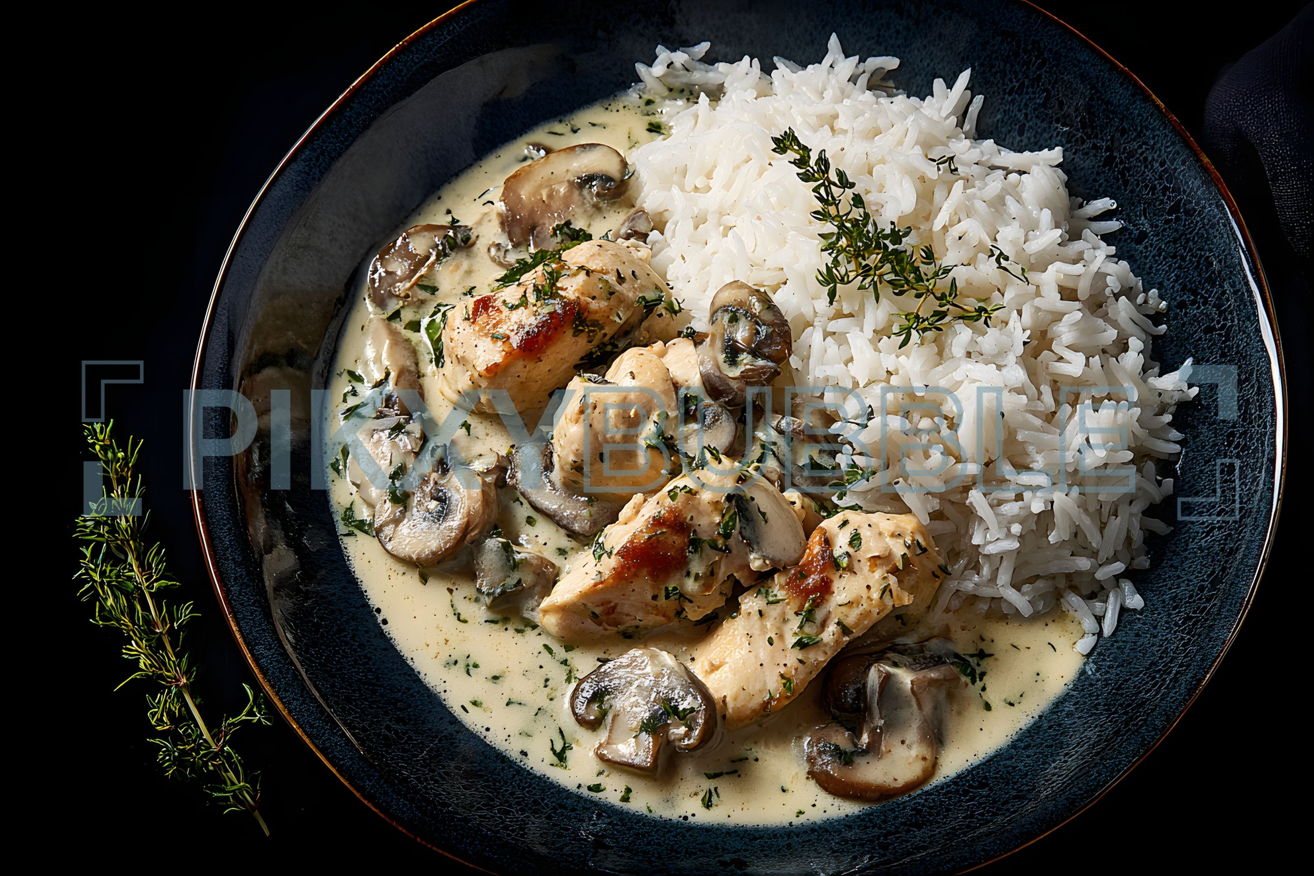 Délicieux poulet crémeux aux champignons servi avec du riz parfumé.