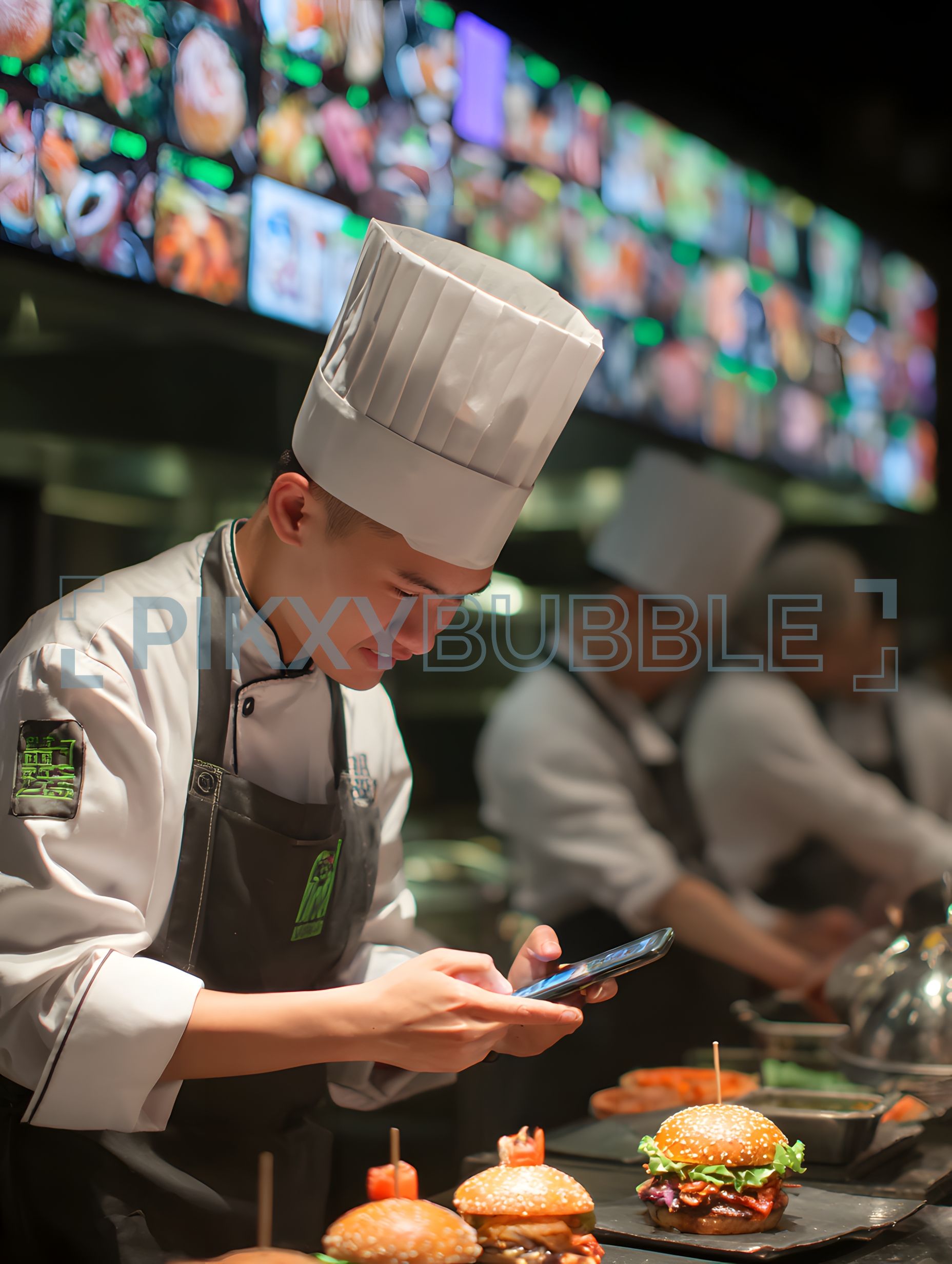 Chef en action: Un chef vérifie son téléphone tout en préparant des plats délicats.