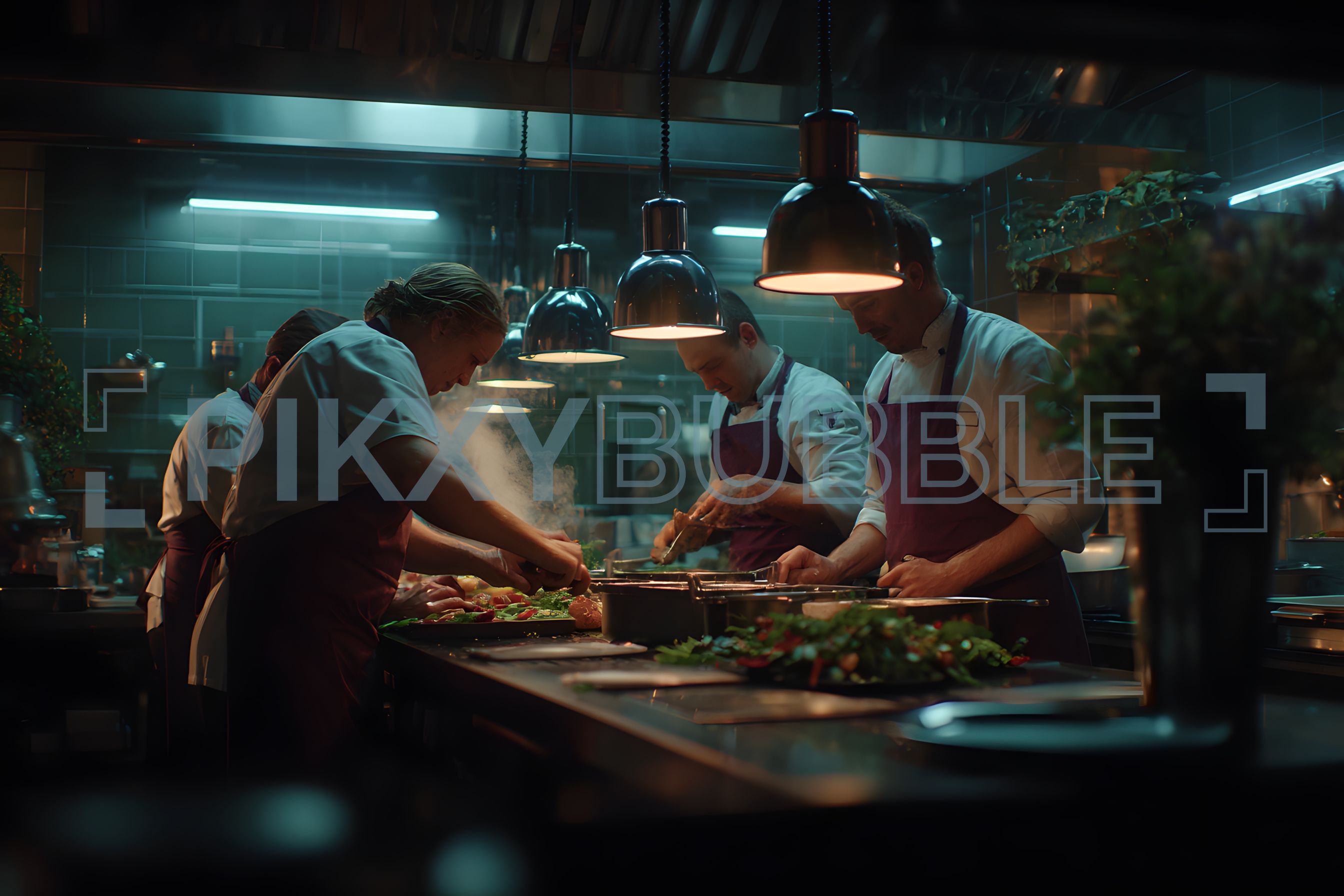 Dans une cuisine dynamique, des chefs s'affairent à préparer des plats exquis. Le parfum des herbes fraîches et des ingrédients de qualité embaume l'air.