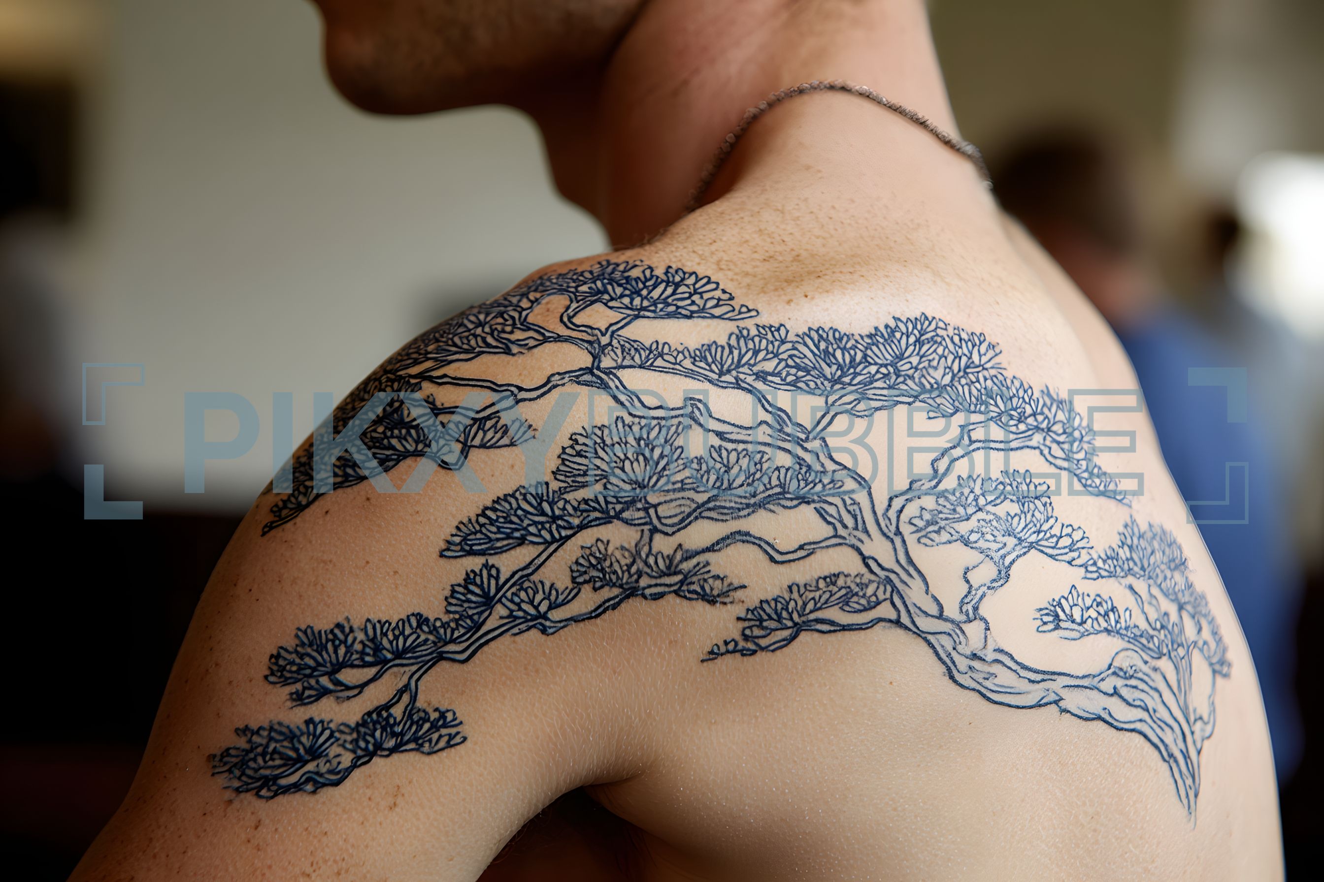 Ce tatouage en noir représente un arbre majestueux avec des branches s'étendant harmonieusement.