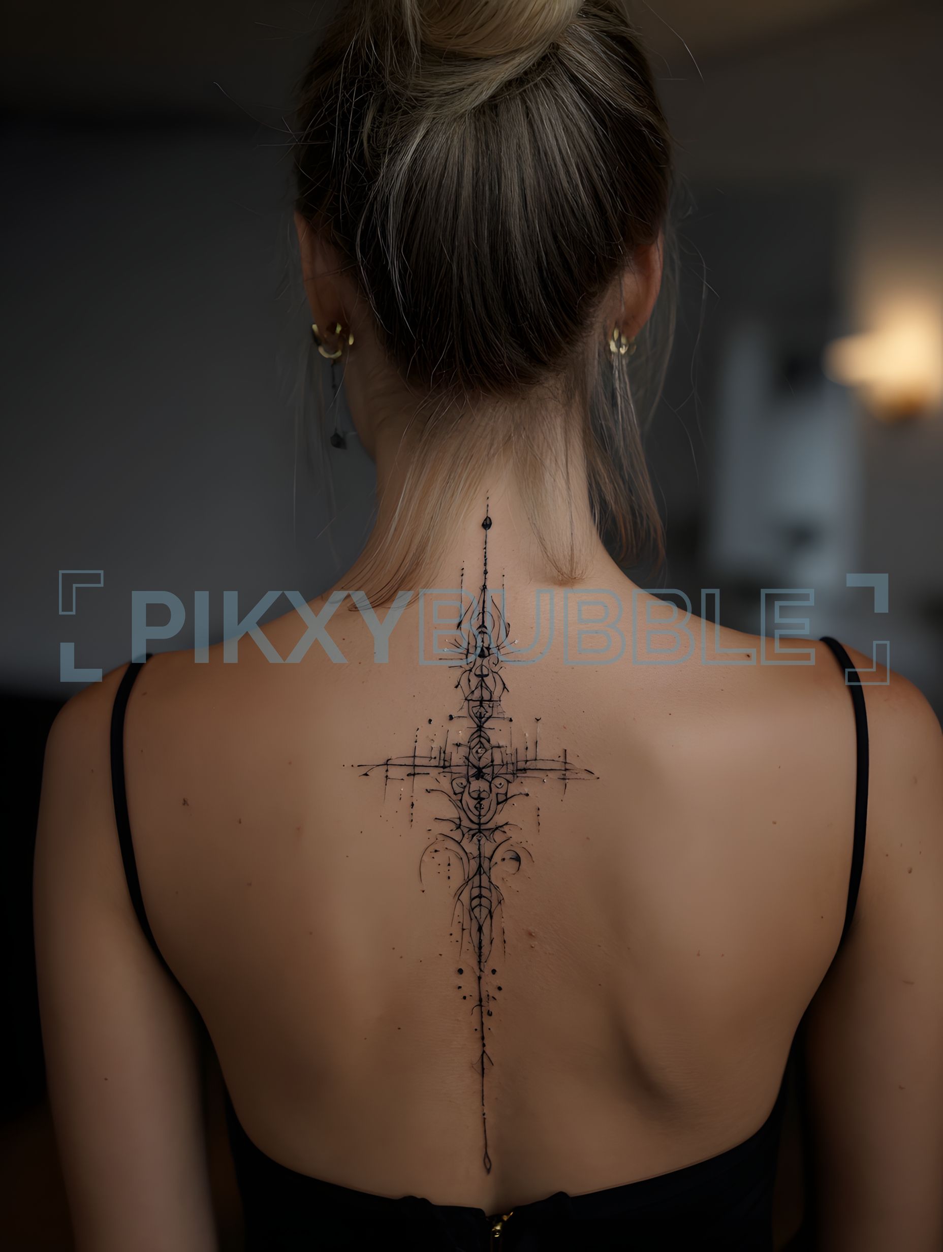 Tatouage élégant sur le dos d'une femme, mettant en avant un design géométrique unique.