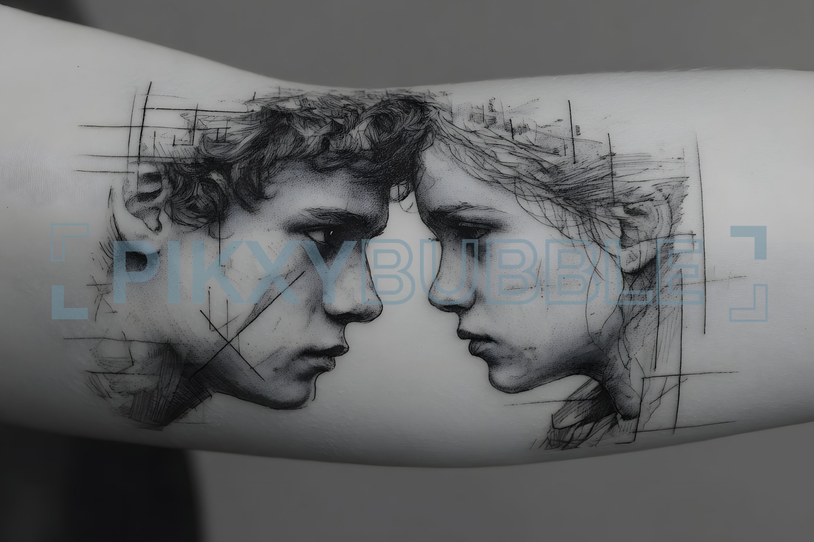 Tatouage artistique représentant deux visages en un seul design. Ce style de