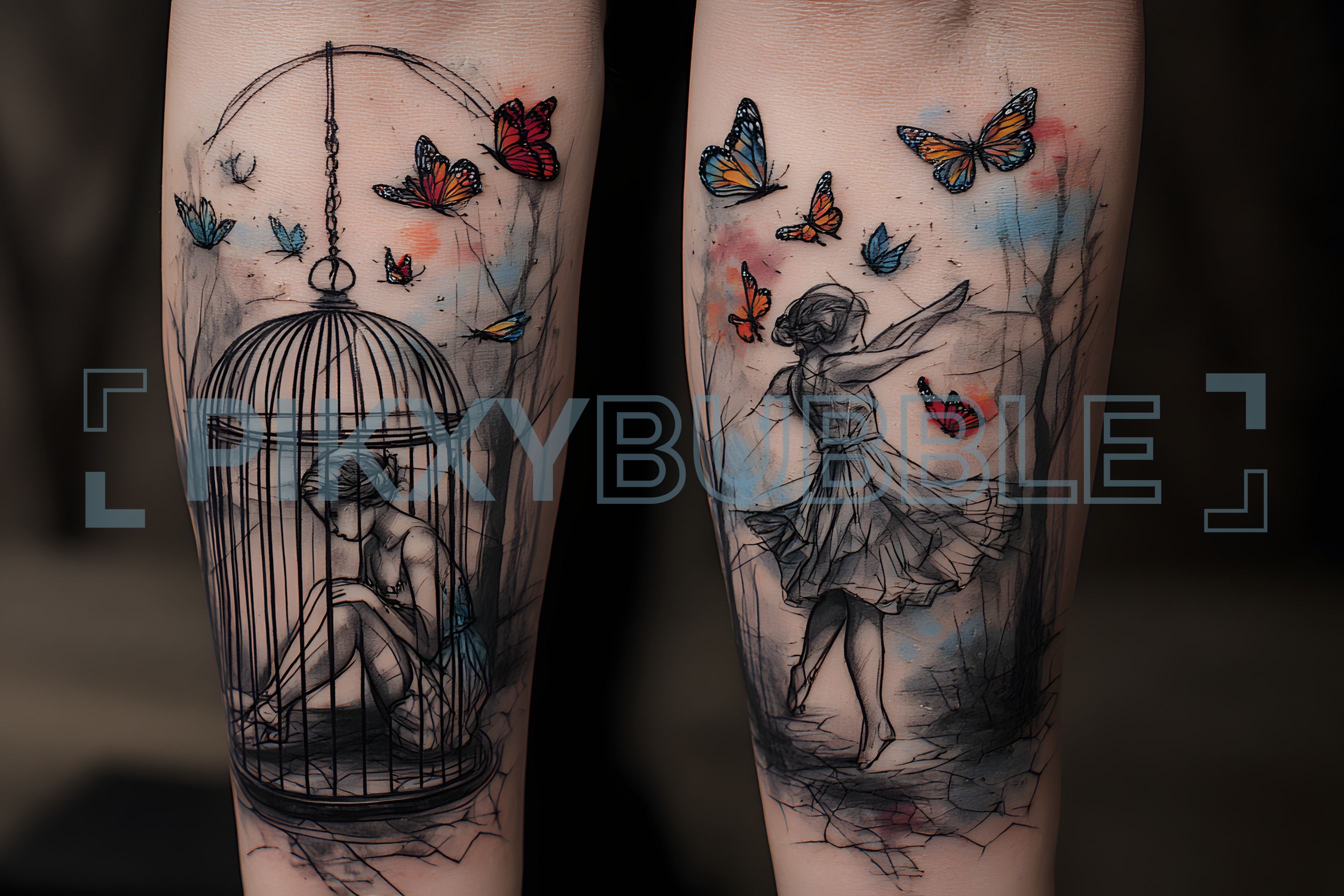 Ce tatouage représente une danseuse s'épanouissant librement, tandis qu'une femme est captivée dans une cage.