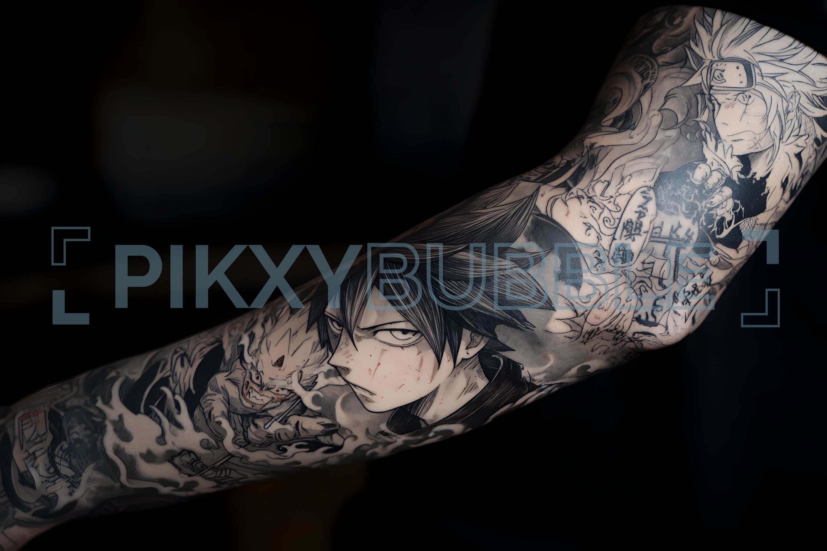 Tatouage emblématique représentant des personnages de manga. Voici quelques éléments importants :