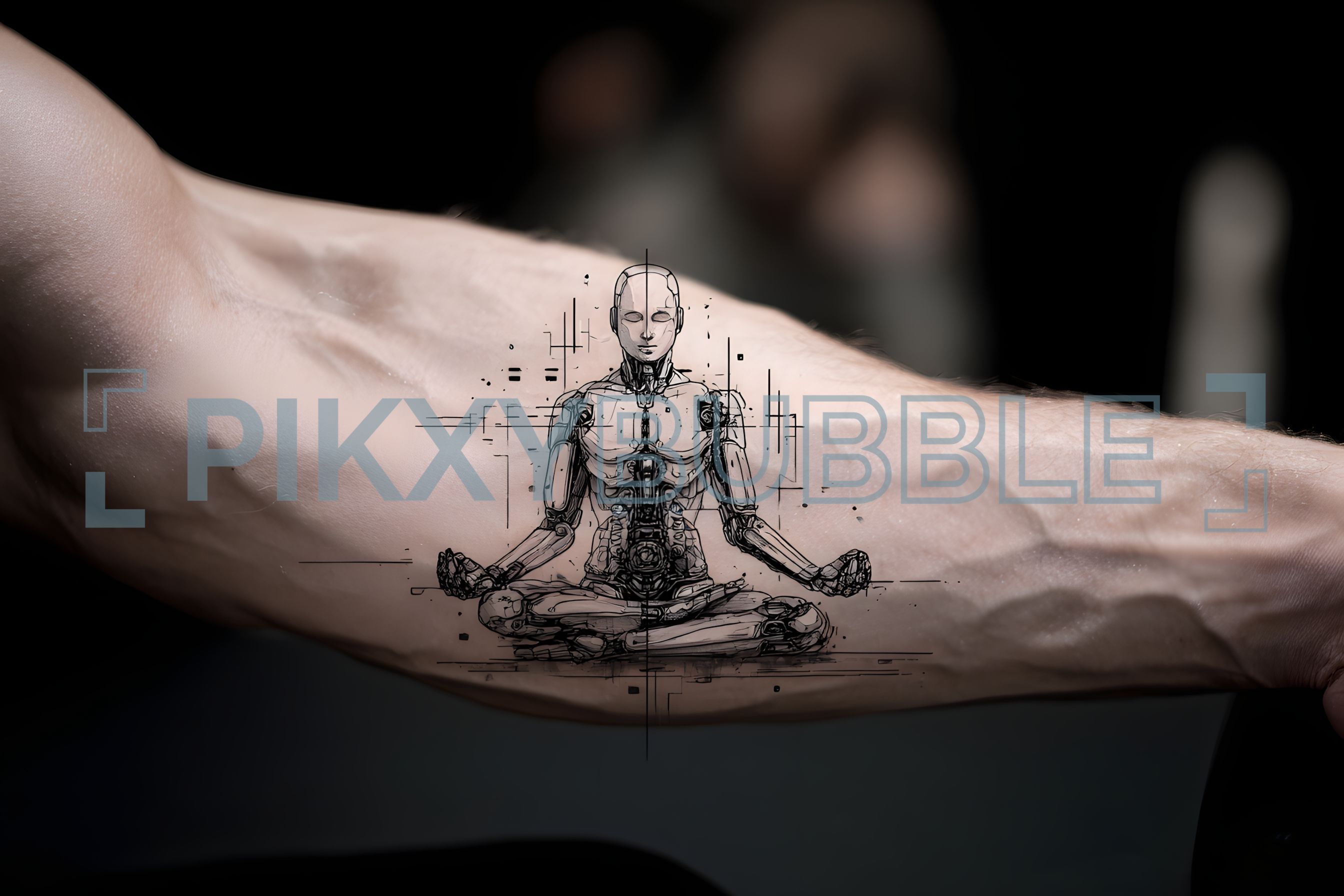 Tatouage de robot méditant représentant une fusion entre l'art et la technologie.