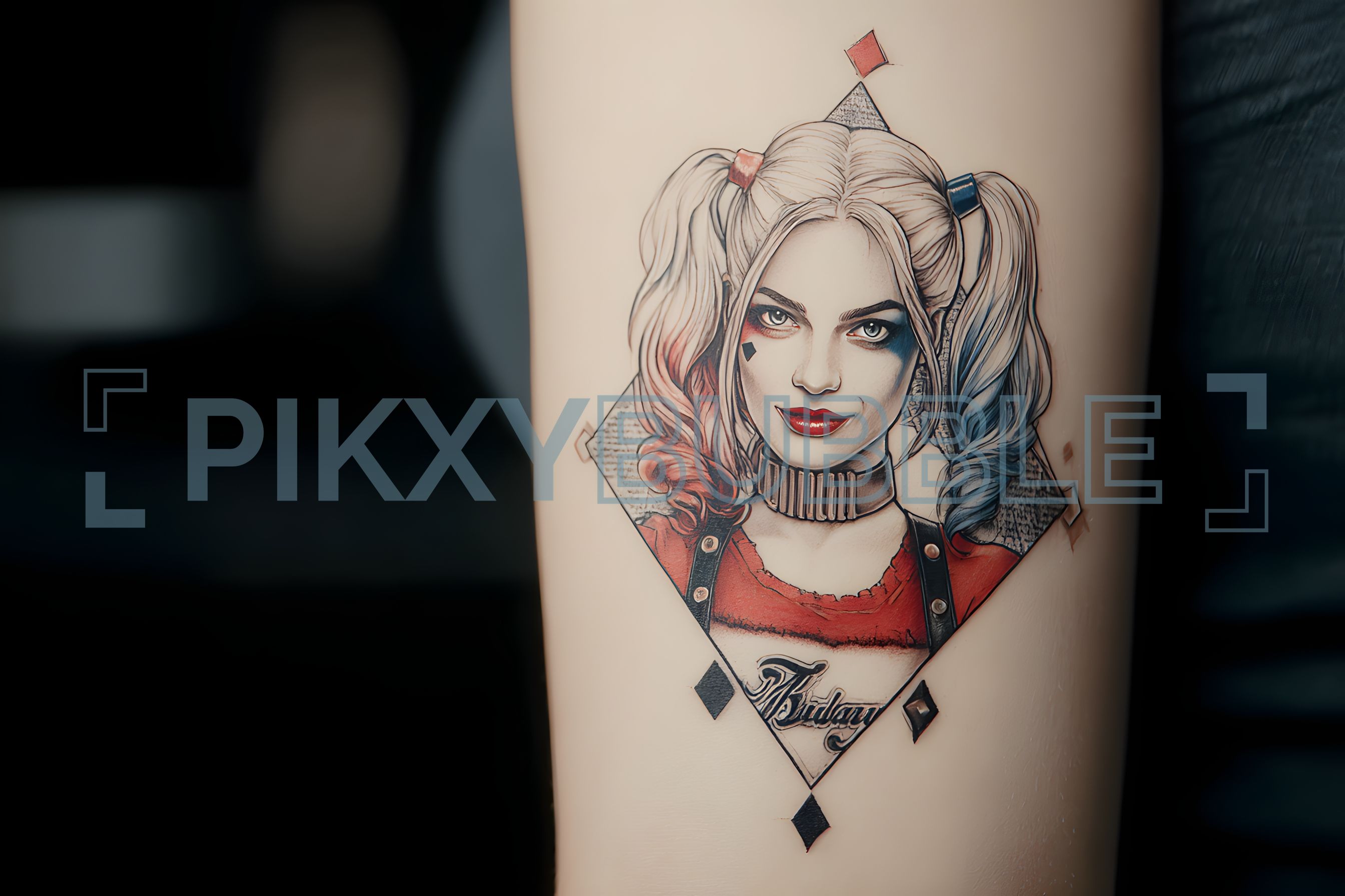 tatouage d'une personnage emblématique avec des couleurs vives. Voici quelques détails :