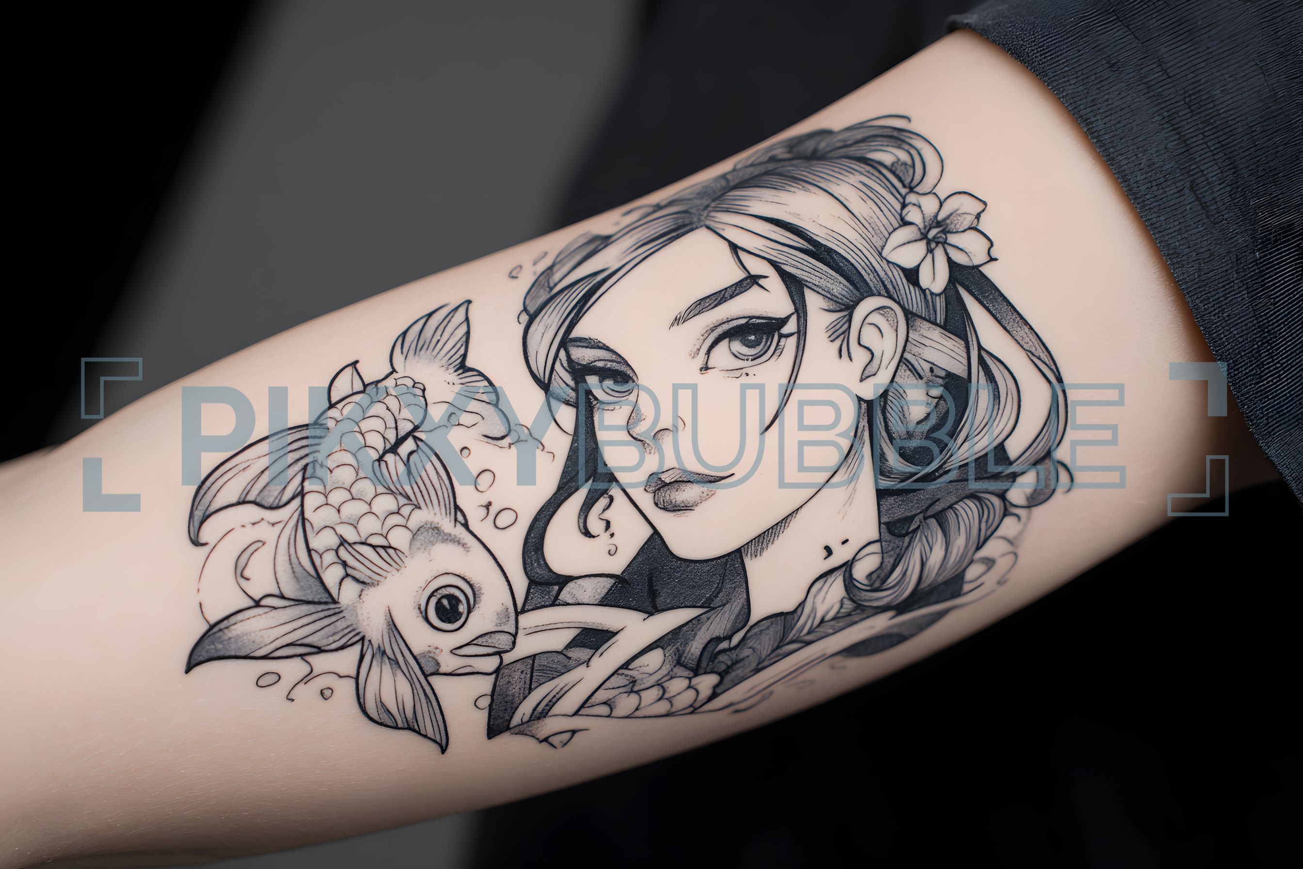 Tatouage fascinant représentant une femme d'une beauté captivante accompagnée de poissons. Voici quelques éléments notables :