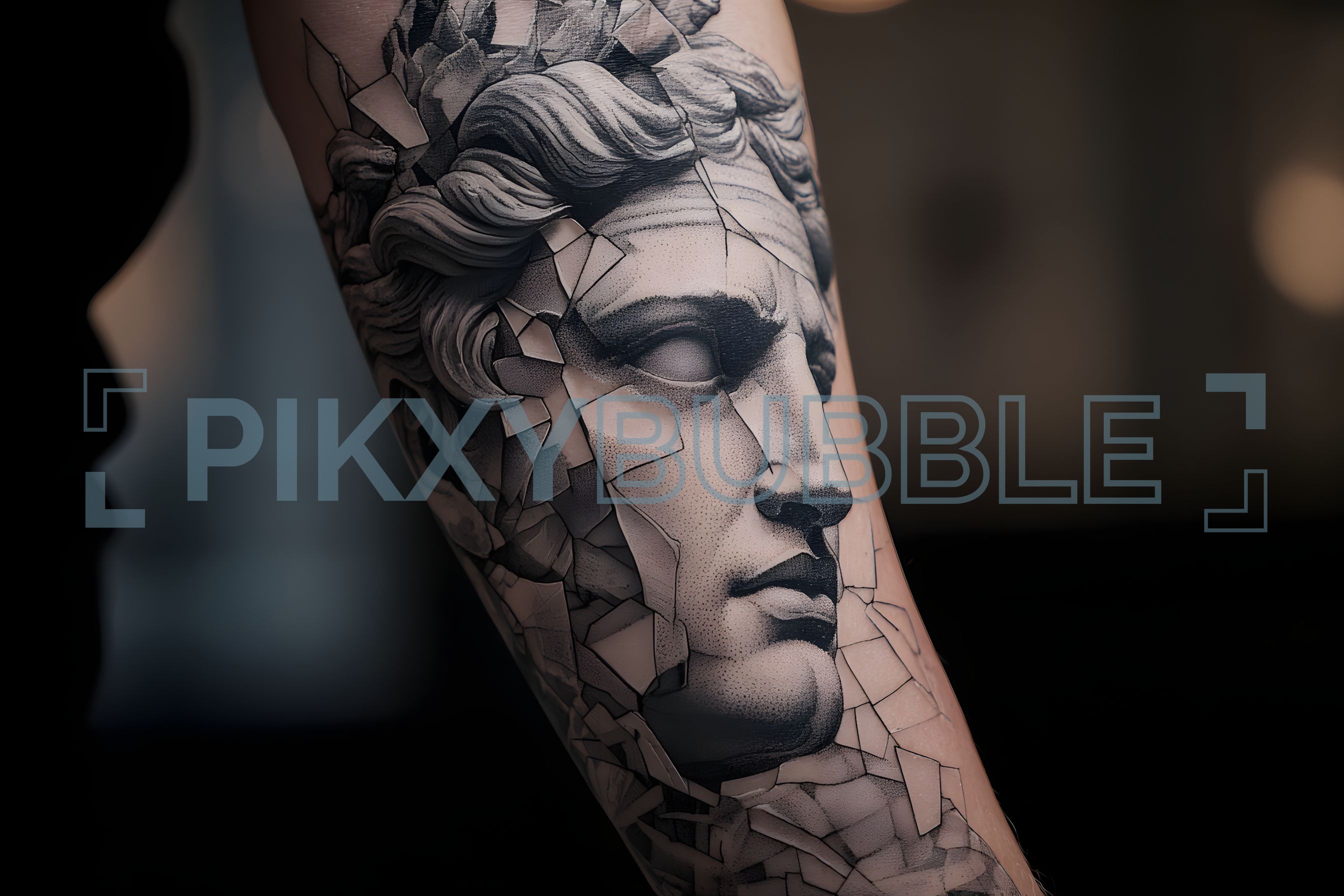 Ce tatouage représente une sculpture célèbre avec des éléments abstraits.