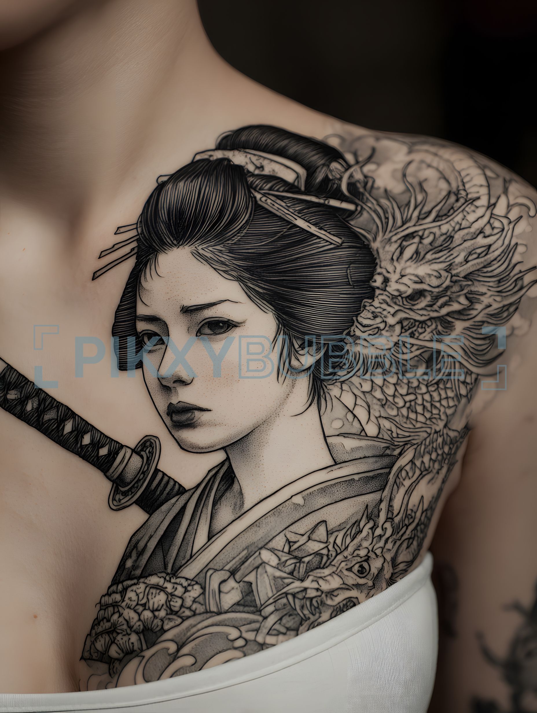 Tatouage d'une geisha avec des détails en noir et blanc. Ce design captivant inclut :