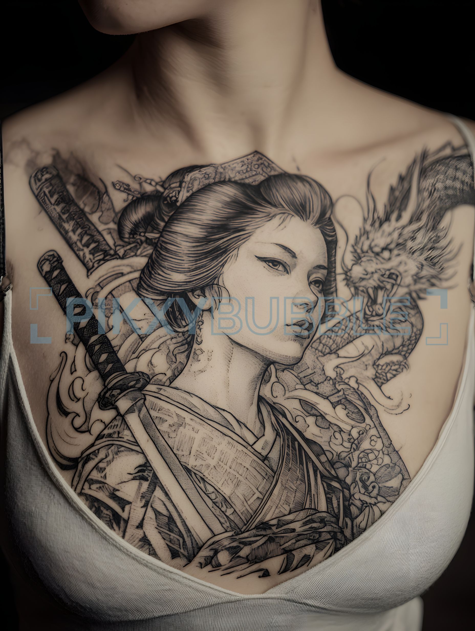 Magnifique tatouage représentant une guerrière japonaise. Voici quelques éléments remarquables :